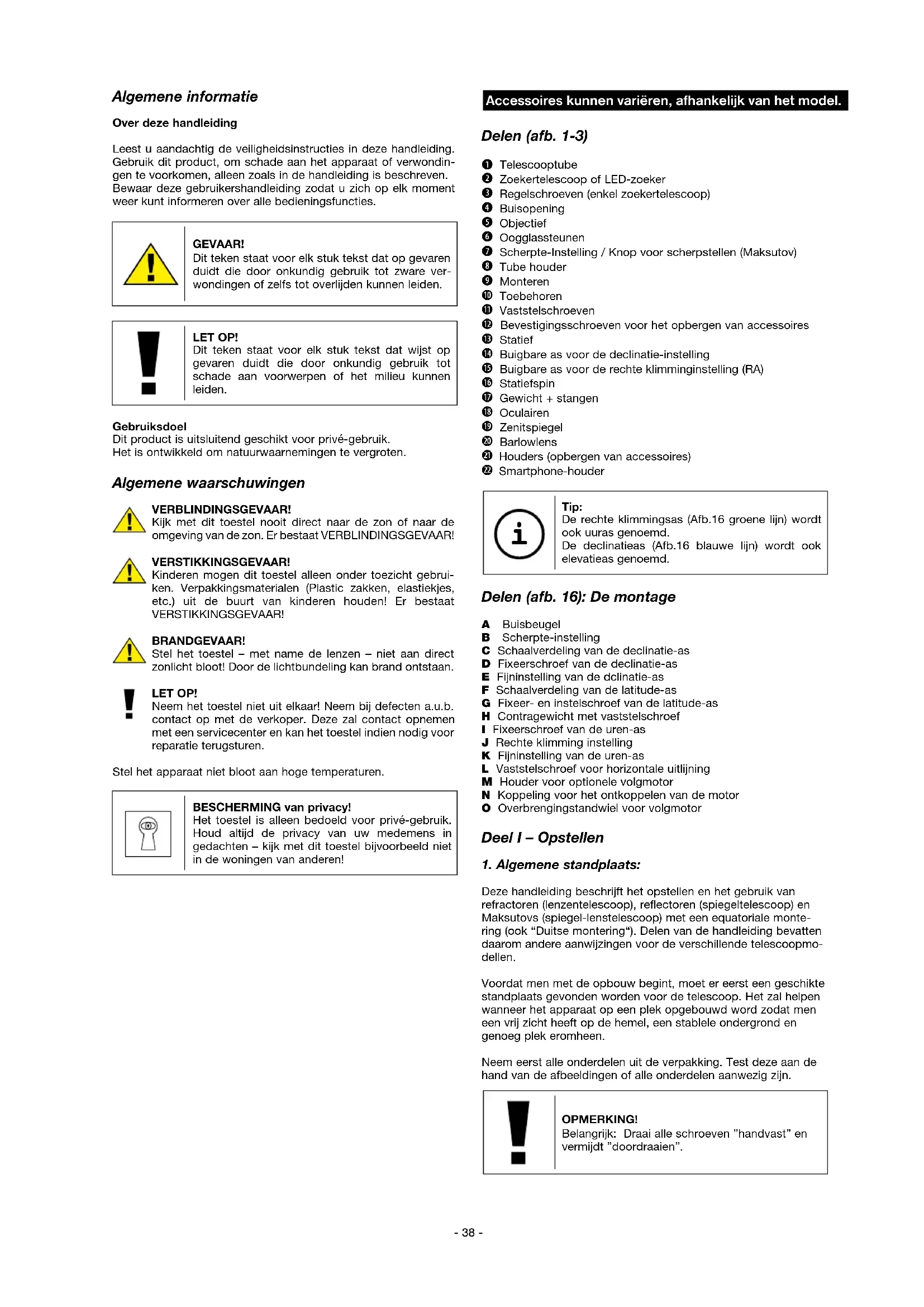 Erros: Ajuda: Sem imagem Levantar a capa de protecção contra o pó e retirar o pára-sol da abertura da objectiva. Imagem impresisa Ajustar a focagem no anel de focagem. Botão para focar (Maksutov) O tipo de construção Maksutov requer event. mais de 20 rotações no botão para focar de forma a obter uma imagem nítida. Regulação de focagem Esperar pela compen sação de temperatura impossivel para equilibrar Má imagem Nunca obserfar por um vidro. Objecto de obseração Ajustar o visor no visor montagem (montagem: ponto 8) mas não visível no telescópio Movimento pesado Telescópio e dos eixos sobre contrapeso os manipulos desequilibrados Apesar do prisma O apoio ocular no prisma de Zenith, imagem de Zenith tem de estar alinhado „torta“ numa posição vertical.- 38 - Algemene informatie Over deze handleiding Leest u aandachtig de veiligheidsinstructies in deze handleiding. Gebruik dit product, om schade aan het apparaat of verwondin- gen te voorkomen, alleen zoals in de handleiding is beschreven. Bewaar deze gebruikershandleiding zodat u zich op elk moment weer kunt informeren over alle bedieningsfuncties. GEVAAR! Dit teken staat voor elk stuk tekst dat op gevaren duidt die door onkundig gebruik tot zware ver- wondingen of zelfs tot overlijden kunnen leiden. LET OP! Dit teken staat voor elk stuk tekst dat wijst op gevaren duidt die door onkundig gebruik tot schade aan voorwerpen of het milieu kunnen leiden. Gebruiksdoel Dit product is uitsluitend geschikt voor privé-gebruik. Het is ontwikkeld om natuurwaarnemingen te vergroten. Algemene waarschuwingen VERBLINDINGSGEVAAR! Kijk met dit toestel nooit direct naar de zon of naar de omgeving van de zon. Er bestaat VERBLINDINGSGEVAAR! VERSTIKKINGSGEVAAR! Kinderen mogen dit toestel alleen onder toezicht gebrui- ken. Verpakkingsmaterialen (Plastic zakken, elastiekjes, etc.) uit de buurt van kinderen houden! Er bestaat VERSTIKKINGSGEVAAR! BRANDGEVAAR! Stel het toestel – met name de lenzen – niet aan direct zonlicht bloot! Door de lichtbundeling kan brand ontstaan. LET OP! Neem het toestel niet uit elkaar! Neem bij defecten a.u.b. contact op met de verkoper. Deze zal contact opnemen met een servicecenter en kan het toestel indien nodig voor reparatie terugsturen. Stel het apparaat niet bloot aan hoge temperaturen. BESCHERMING van privacy! Het toestel is alleen bedoeld voor privé-gebruik. Houd altijd de privacy van uw medemens in gedachten – kijk met dit toestel bijvoorbeeld niet in de woningen van anderen! Accessoires kunnen variëren, afhankelijk van het model. Delen (afb. 1-3)