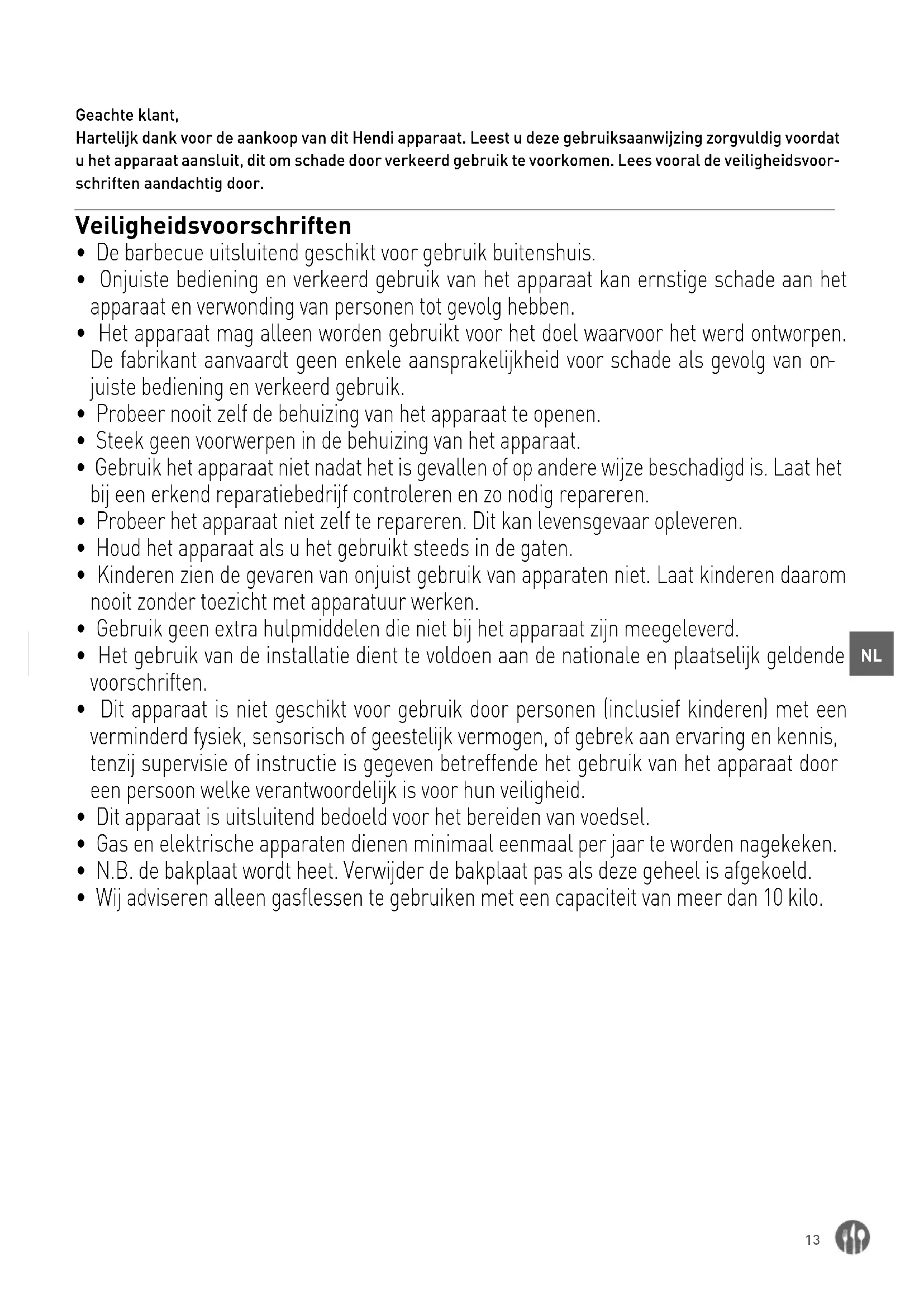 Geachte klant, Hartelijk dank voor de aankoop van dit Hendi apparaat. Leest u deze gebruiksaanwijzing zorgvuldig voordat u het apparaat aansluit, dit om schade door verkeerd gebruik te voorkomen. Lees vooral de veiligheidsvoor- schriften aandachtig door. Veiligheidsvoorschriften