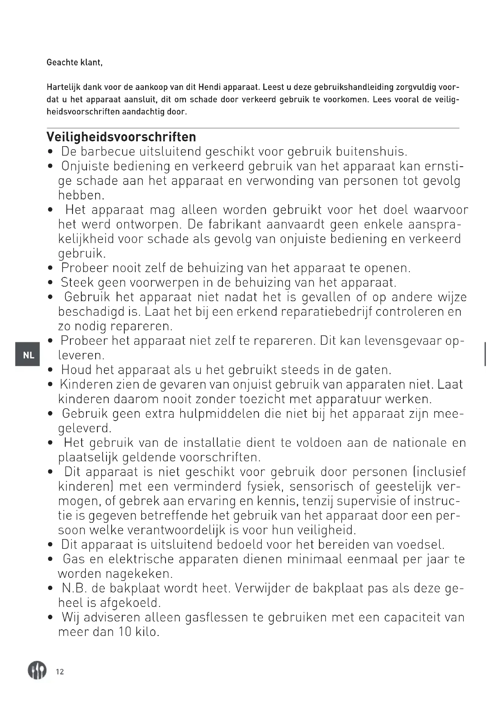 Geachte klant, Hartelijk dank voor de aankoop van dit Hendi apparaat. Leest u deze gebruikshandleiding zorgvuldig voor- dat u het apparaat aansluit, dit om schade door verkeerd gebruik te voorkomen. Lees vooral de veilig- heidsvoorschriften aandachtig door. Veiligheidsvoorschriften