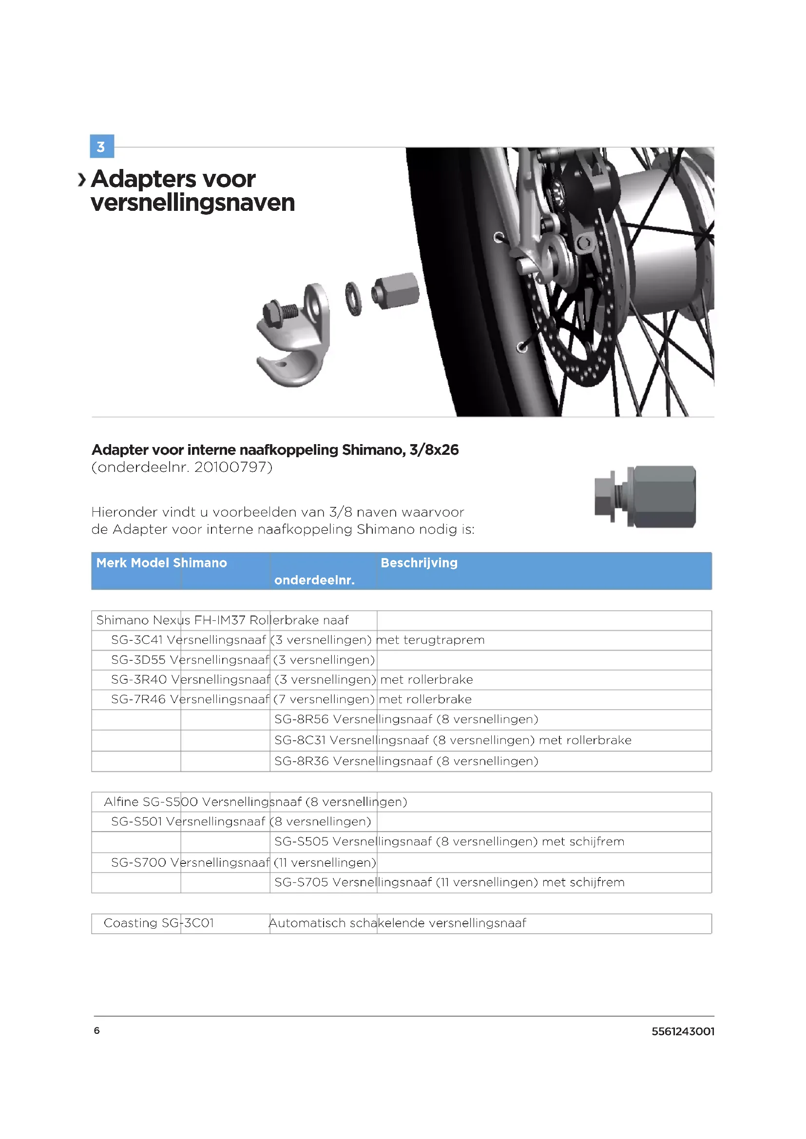 Adapter voor interne naafkoppeling Shimano, 3/8x26 (onderdeelnr. 20100797) Hieronder vindt u voorbeelden van 3/8 naven waarvoor de Adapter voor interne naafkoppeling Shimano nodig is: Merk Model Shimano onderdeelnr. Beschrijving Shimano Nexus FH-IM37 Rollerbrake naaf SG-3C41 Versnellingsnaaf (3 versnellingen) met terugtraprem SG-3D55 Versnellingsnaaf (3 versnellingen) SG-3R40 Versnellingsnaaf (3 versnellingen) met rollerbrake SG-7R46 Versnellingsnaaf (7 versnellingen) met rollerbrake SG-8R56 Versnellingsnaaf (8 versnellingen) SG-8C31 Versnellingsnaaf (8 versnellingen) met rollerbrake SG-8R36 Versnellingsnaaf (8 versnellingen) Alfine SG-S500 Versnellingsnaaf (8 versnellingen) SG-S501 Versnellingsnaaf (8 versnellingen) SG-S505 Versnellingsnaaf (8 versnellingen) met schijfrem SG-S700 Versnellingsnaaf (11 versnellingen) SG-S705 Versnellingsnaaf (11 versnellingen) met schijfrem Coasting SG-3C01 Automatisch schakelende versnellingsnaaf Adapters voor versnellingsnaven