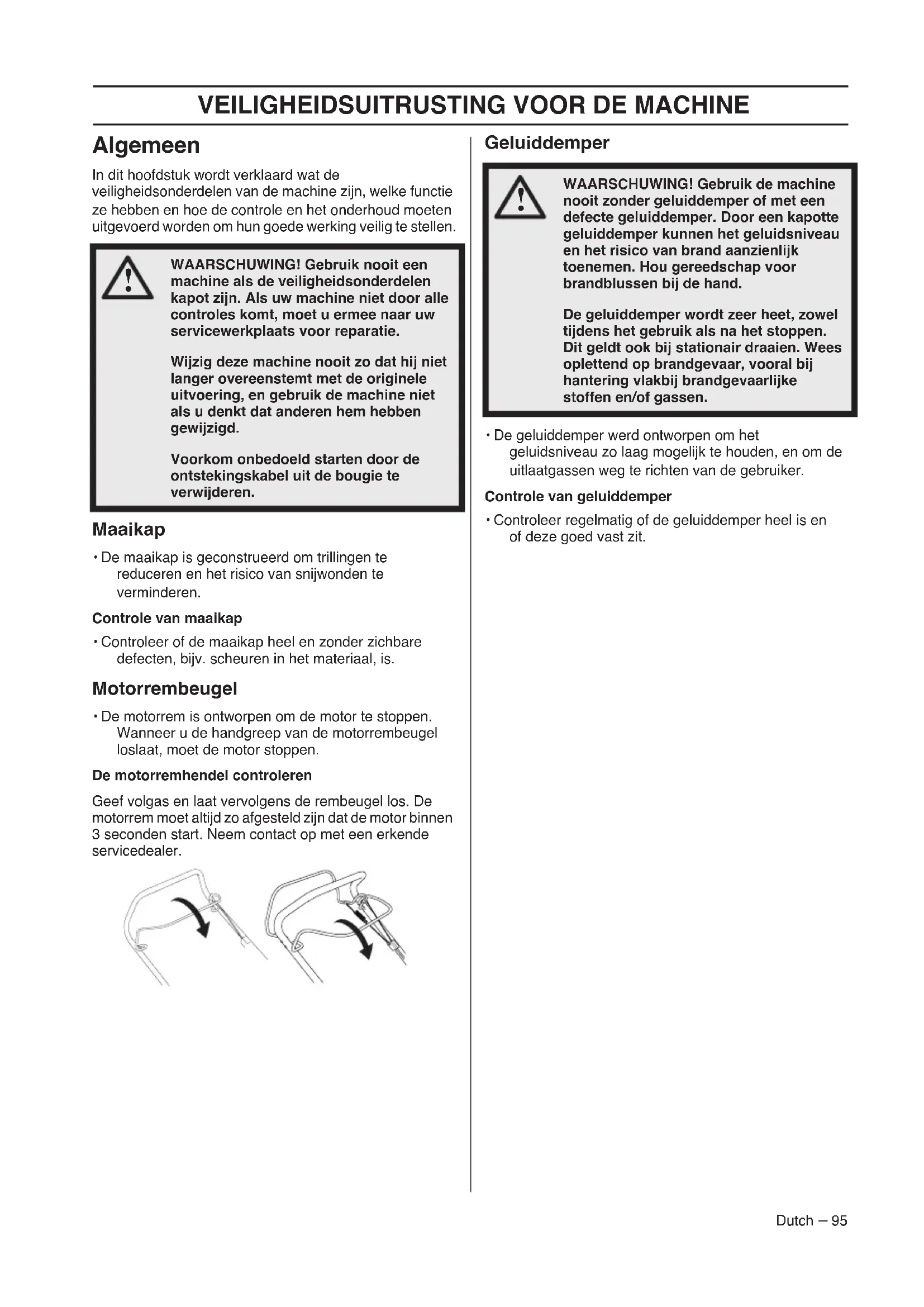 1 Motorrembeugel2 Voortdrijvingsstang (M46-125R Classic+, M46-110R Classic, M51-140WR Classic+, M51-150WR Classic, M51-150R Classic, M53-150WR Classic)3 Starthendel4 Opvangbak5 Hendel, hoogte handgreep6 Maaihoogtehendel7 Peilstok/olie bijvullen8 Geluiddemper9 Bougie10 Onderste handvatbeugel11 Brandstof bijvullen12 Luchtfilter13 Primerbalg14 Maaikap15 Geleider starterkoord16 Mes17 Veerring18 Mesbout19 Gebruiksaanwijzing20 Aftapplug vlotterkamerVEILIGHEIDSUITRUSTING VOOR DE MACHINE Dutch – 95 Algemeen In dit hoofdstuk wordt verklaard wat de veiligheidsonderdelen van de machine zijn, welke functie ze hebben en hoe de controle en het onderhoud moeten uitgevoerd worden om hun goede werking veilig te stellen. Maaikap