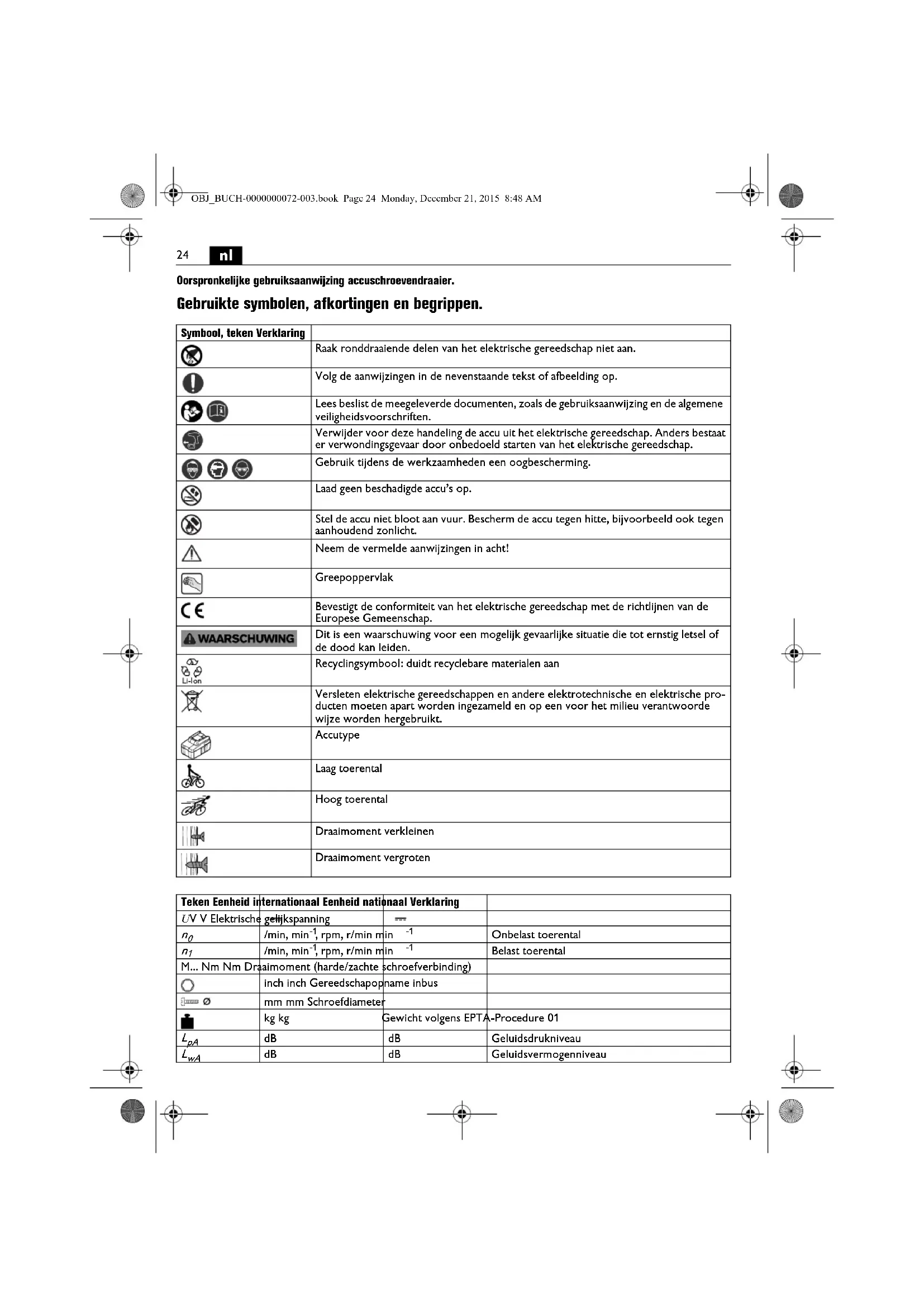 Oorspronkelijke gebruiksaanwijzing accuschroevendraaier. Gebruikte symbolen, afkortingen en begrippen. Symbool, teken Verklaring Raak ronddraaiende delen van het elektrische gereedschap niet aan. Volg de aanwijzingen in de nevenstaande tekst of afbeelding op. Lees beslist de meegeleverde documenten, zoals de gebruiksaanwijzing en de algemene veiligheidsvoorschriften. Verwijder voor deze handeling de accu uit het elektrische gereedschap. Anders bestaat er verwondingsgevaar door onbedoeld starten van het elektrische gereedschap. Gebruik tijdens de werkzaamheden een oogbescherming. Laad geen beschadigde accu’s op. Stel de accu niet bloot aan vuur. Bescherm de accu tegen hitte, bijvoorbeeld ook tegen aanhoudend zonlicht. Neem de vermelde aanwijzingen in acht! Greepoppervlak Bevestigt de conformiteit van het elektrische gereedschap met de richtlijnen van de Europese Gemeenschap. Dit is een waarschuwing voor een mogelijk gevaarlijke situatie die tot ernstig letsel of de dood kan leiden. Recyclingsymbool: duidt recyclebare materialen aan Versleten elektrische gereedschappen en andere elektrotechnische en elektrische pro- ducten moeten apart worden ingezameld en op een voor het milieu verantwoorde wijze worden hergebruikt. Accutype Laag toerental Hoog toerental Draaimoment verkleinen Draaimoment vergroten Teken Eenheid internationaal Eenheid nationaal Verklaring U V V Elektrische gelijkspanning
