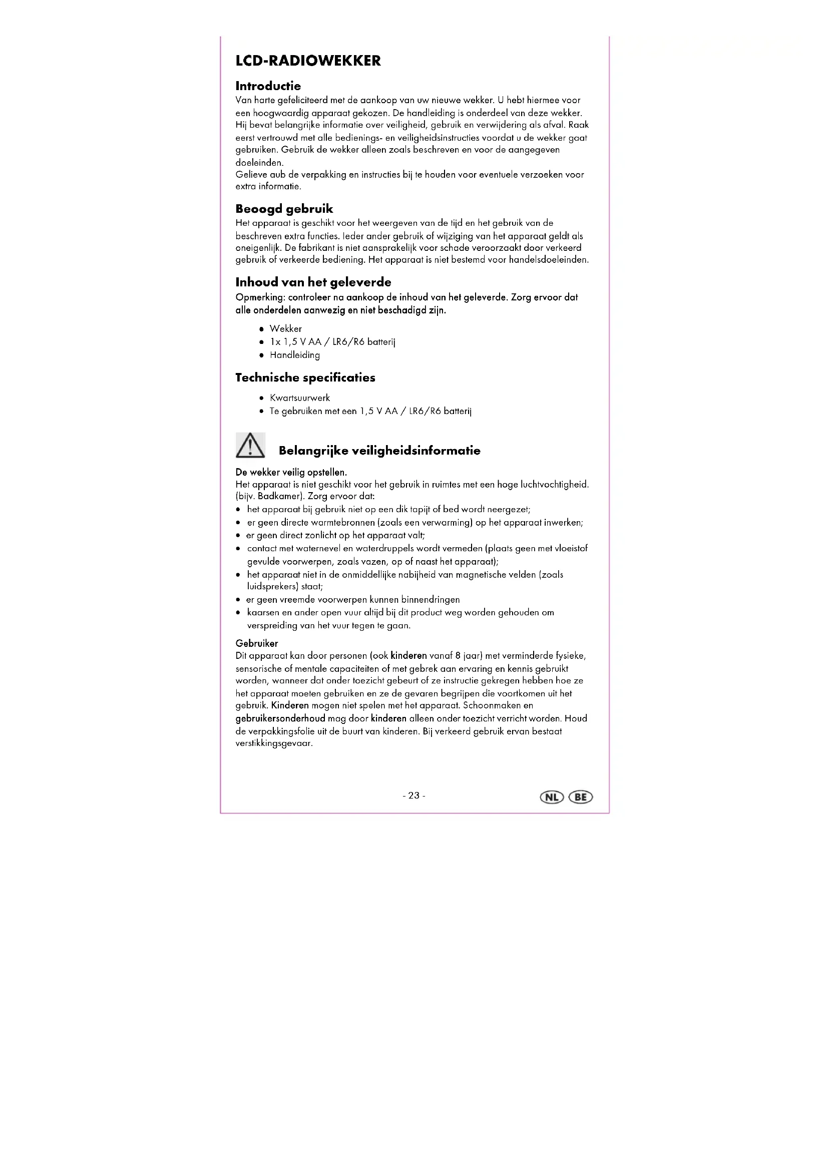 LCD-RADIOWEKKER Introductie Van harte gefeliciteerd met de aankoop van uw nieuwe wekker. U hebt hiermee voor een hoogwaardig apparaat gekozen. De handleiding is onderdeel van deze wekker. Hij bevat belangrijke informatie over veiligheid, gebruik en verwijdering als afval. Raak eerst vertrouwd met alle bedienings- en veiligheidsinstructies voordat u de wekker gaat gebruiken. Gebruik de wekker alleen zoals beschreven en voor de aangegeven doeleinden. Gelieve aub de verpakking en instructies bij te houden voor eventuele verzoeken voor extra informatie. Beoogd gebruik Het apparaat is geschikt voor het weergeven van de tijd en het gebruik van de beschreven extra functies. Ieder ander gebruik of wijziging van het apparaat geldt als oneigenlijk. De fabrikant is niet aansprakelijk voor schade veroorzaakt door verkeerd gebruik of verkeerde bediening. Het apparaat is niet bestemd voor handelsdoeleinden. Inhoud van het geleverde Opmerking: controleer na aankoop de inhoud van het geleverde. Zorg ervoor dat alle onderdelen aanwezig en niet beschadigd zijn.