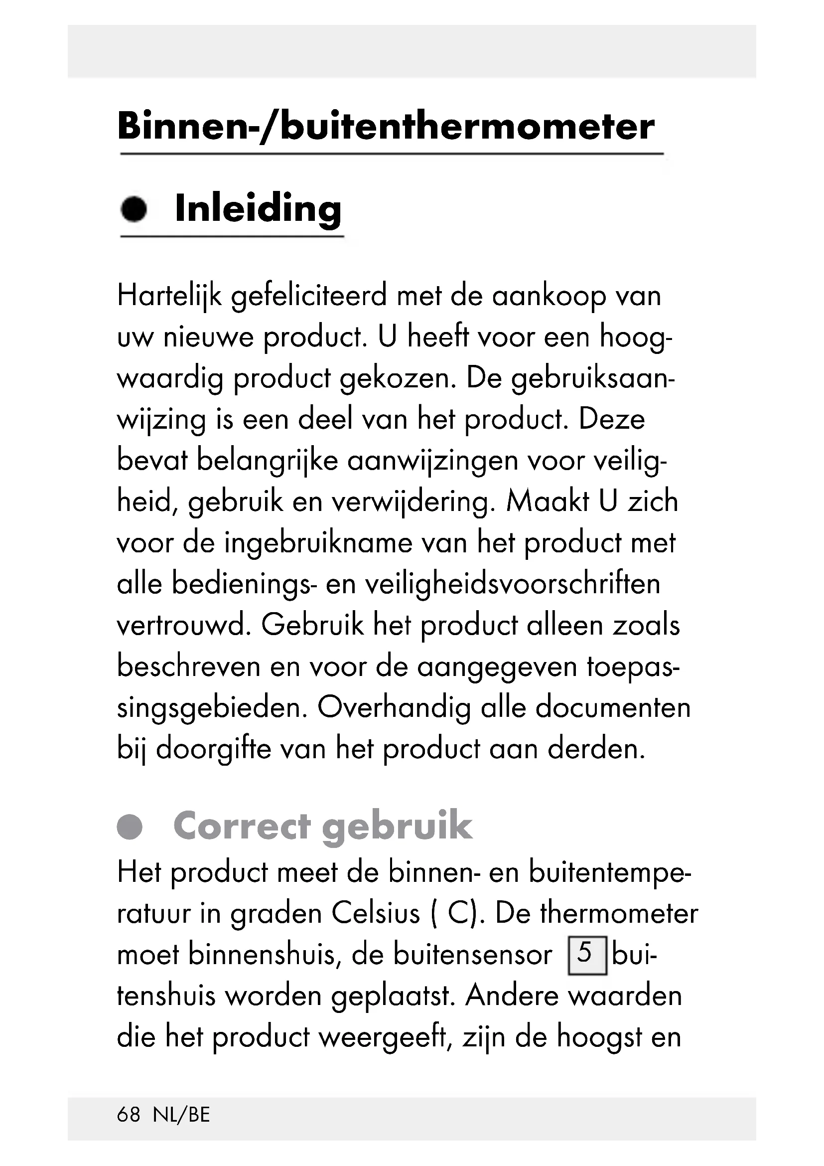 Het product meet de binnen- en buitentemperatuur in graden Celsius ( C). De thermometer moet binnenshuis, de buitensensor 5 buitenshuis worden geplaatst. Andere waarden die het product weergeeft, zijn de hoogst en