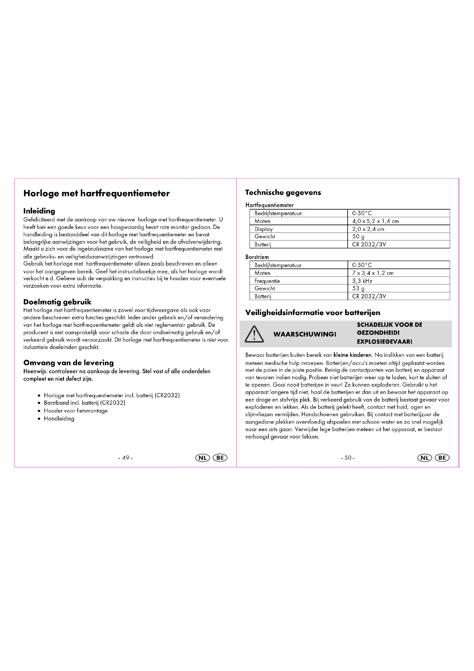 Garantievoorwaarde De garantieperiode begint met de aankoopdatum. Bewaar de originele kassabon goed. Deze wordt als bewijs voor de aankoop benodigd. Indien binnen drie jaren na aankoop van het horloge met hartfrequentiemeter een materiaal- of fabricagefout optreedt, wordt het horloge met hartfrequentiemeter door ons- bij vrije keus voor ons- kostenloos gerepareerd of vervangen. Dit gebeurt op voorwaarde dat binnen de 3 jaar termijn het defecte horloge met hartfrequentiemeter met het aankoopbewijs (kassabon) wordt voorgelegd, samen met een korte beschrijving van de opgetreden fout en sinds wanneer deze bestaat. Als het defect door onze garantie wordt afgedekt, ontvangt u het nieuwe of gerepareerde horloge met hartfrequentiemeter terug. Met de reparatie of vervanging van het product begint géén nieuwe garantieperiode! Garantieperiode en wettelijk geregelde aansprakelijkheid bij mangel De garantieperiode wordt door de garantieverlening niet verlengd. Dit geldt ook voor onderdelen die zijn gerepareerd of vervangen. Eventuele beschadigingen en/of mangel die al gelijk na aankoop worden vastgesteld dienen meteen na het uitpakken meegedeeld te worden. Na afloop van de garantieperiode vallen alle reparatiekosten onder de betalingsplicht! Garantieomvang Het horloge met hartfrequentiemeter is volgens een strenge kwaliteitsnorm zorgvuldig geproduceerd en voor aflevering nauwgezet gecontroleerd. De garantieverlening geldt voor materiaal- of fabricagefouten. De garantie betrekt zich níet op productonderdelen, die bij normaal gebruik verslijten of op beschadigingen van breekbare onderdelen, zoals bijv. schakelaartjes, accus of glas. De garantie vervalt, als het horloge met hartfrequentiemeter beschadigt, of ondeskundig gebruikt of onderhouden is.Voor een doelmatig gebruik van het horloge met hartfrequentiemeter zijn alle in de handleiding beschreven aanwijzingen precies in acht te nehmen. Gebruik en handelingen die in de handleiding worden afgeraden of voor welke gewaarschuwd word zijn in ieder geval te vermijden!-