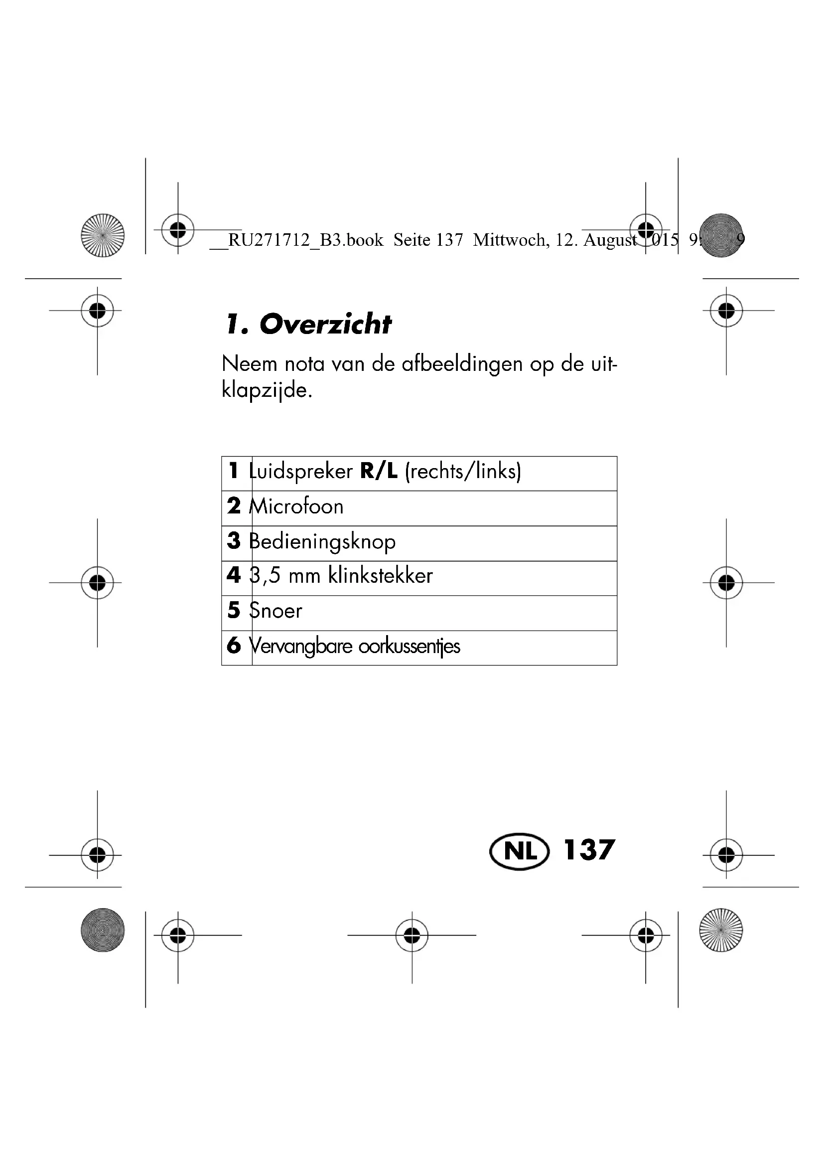 Neem nota van de afbeeldingen op de uit- klapzijde. 1 Luidspreker R/L (rechts/links) 2 Microfoon 3 Bedieningsknop 4 3,5 mm klinkstekker 5 Snoer 6 Vervangbare oorkussentjes