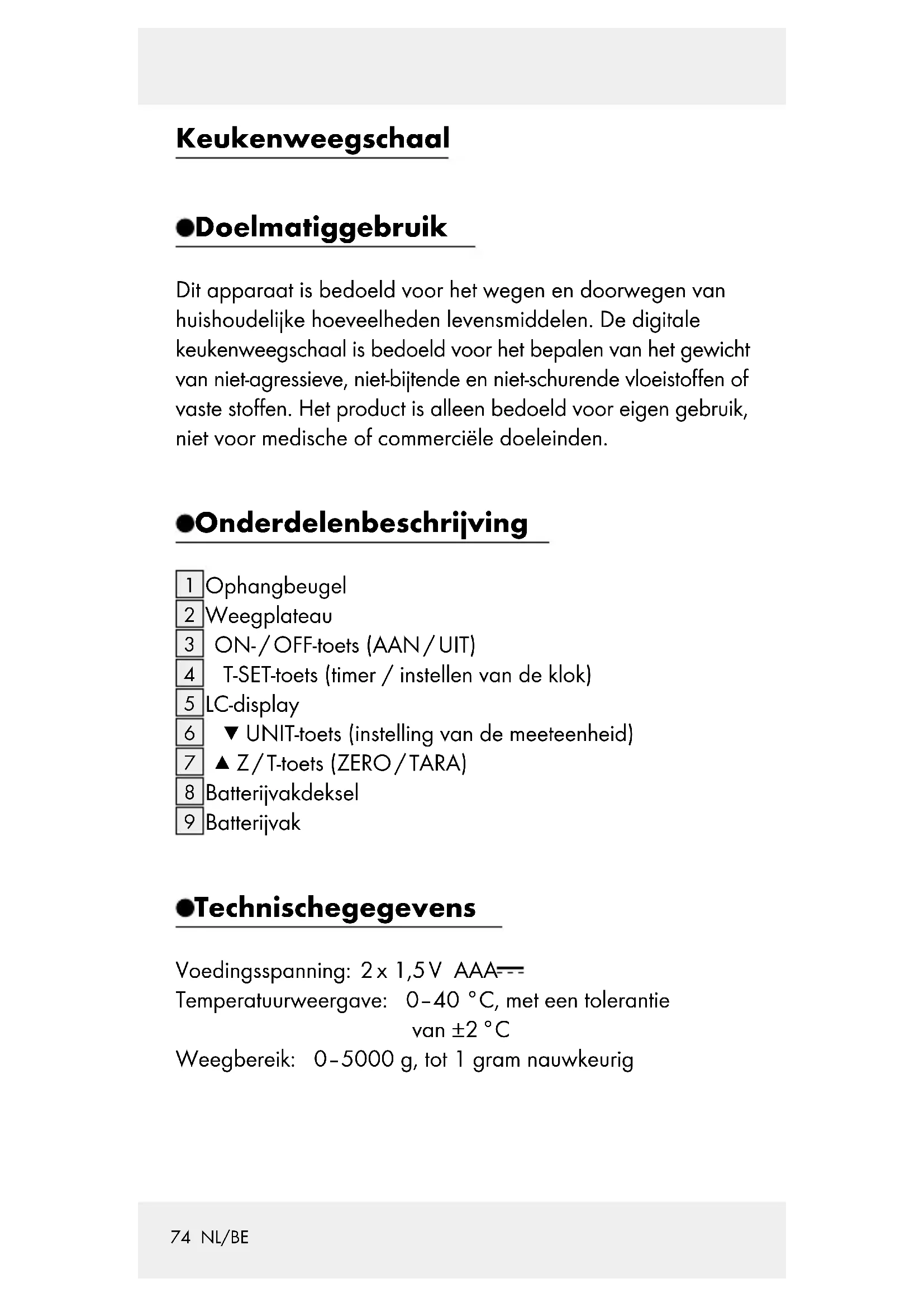 KLEUTERS EN KINDEREN! Laat kin- deren nooit zonder toezicht bij het verpak- kingsmateriaal. Er bestaat gevaar voor verstikking door verpakkingsmateriaal. Kinderen onderschatten de gevaren vaak. Houd kinderen steeds uit de buurt van het verpakkingsmateriaal.76 NL/BE LEVENSGE- VAAR! Batterijen kunnen worden inge- slikt, hetgeen levensgevaarlijk kan zijn. Wanneer een batterij is ingeslikt, moet onmiddellijk medische hulp worden in- geroepen. Dit apparaat kan door kinderen vanaf 8 alsook personen met verminderde psychische, sensorische of mentale vaar- digheden of een gebrek aan ervaring en/of kennis worden gebruikt, als zij onder toezicht staan of geïnstrueerd werden met betrekking tot het veilige gebruik van het apparaat en de hieruit voortvloeiende gevaren begrijpen. Kin- deren mogen niet met het apparaat spe- len. Reiniging en gebruikersonderhoud mogen niet door kinderen zonder toe- zicht worden uitgevoerd. 5 kg VOORZICHTIG! Belast de weegschaal niet met meer dan 5 kg. Het product kan anders bescha- digd raken. Bescherm het product tegen elektrostati- sche lading / ontlading. Dit kan een77 NL/BE belemmering voor de interne data-trans- missie veroorzaken, wat fouten in het LC-display genereert. Controleer het product voor ingebruik- name op beschadigingen. Gebruik nooit een beschadigd product. Open nooit de behuizing van het product. Letsel en beschadigingen aan het product kunnen het gevolg zijn. Laat reparaties alléén uitvoeren door het een elektromonteur. Verzeker u ervan dat iedereen, die het product gebruikt, de gebruiksaanwijzing heeft gelezen en in staat is, het product veilig te bedienen. Plaats het product op een stevige, hori- zontale en vlakke ondergrond. De functies van het product kunnen door magnetische storingsvelden nega- tief worden beïnvloed. Verwijder in ge- val van dergelijke functiestoringen even de batterijen uit het product en plaats deze opnieuw.