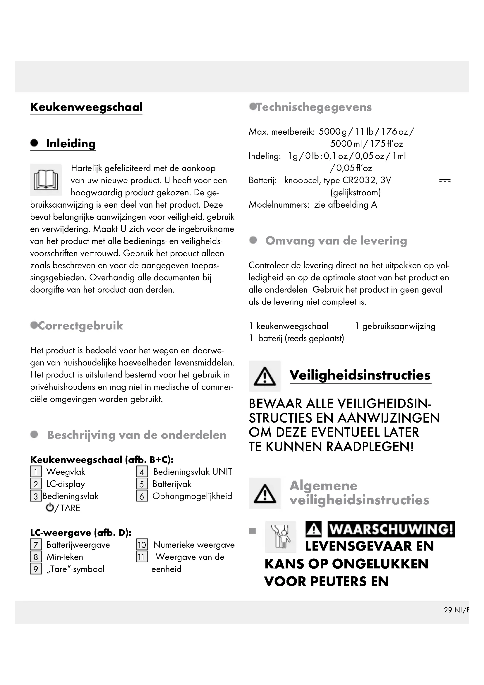 Weergave van de eenheid Technische gegevens Max. meetbereik: 5000 g / 11 lb / 176 oz / 5000 ml / 175 fl’oz Indeling: 1g / 0 lb : 0,1 oz / 0,05 oz / 1ml / 0,05 fl’oz Batterij: knoopcel, type CR2032, 3V (gelijkstroom) Modelnummers: zie afbeelding A Omvang van de levering Controleer de levering direct na het uitpakken op vol- ledigheid en op de optimale staat van het product en alle onderdelen. Gebruik het product in geen geval als de levering niet compleet is. 1 keukenweegschaal 1 batterij (reeds geplaatst) 1 gebruiksaanwijzing Veiligheidsinstructies