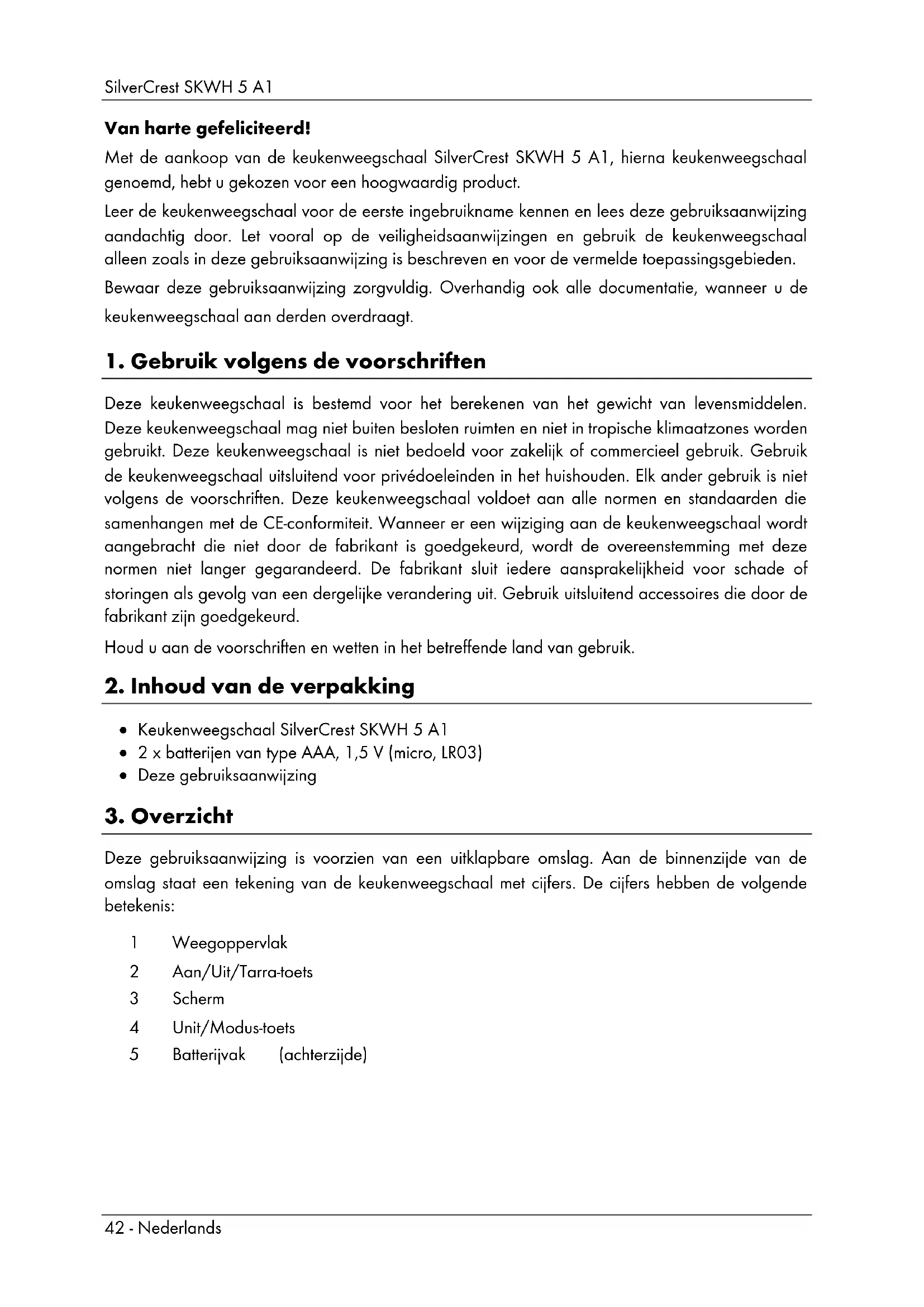 Van harte gefeliciteerd! Met de aankoop van de keukenweegschaal SilverCrest SKWH 5 A1, hierna keukenweegschaal genoemd, hebt u gekozen voor een hoogwaardig product. Leer de keukenweegschaal voor de eerste ingebruikname kennen en lees deze gebruiksaanwijzing aandachtig door. Let vooral op de veiligheidsaanwijzingen en gebruik de keukenweegschaal alleen zoals in deze gebruiksaanwijzing is beschreven en voor de vermelde toepassingsgebieden. Bewaar deze gebruiksaanwijzing zorgvuldig. Overhandig ook alle documentatie, wanneer u de keukenweegschaal aan derden overdraagt.