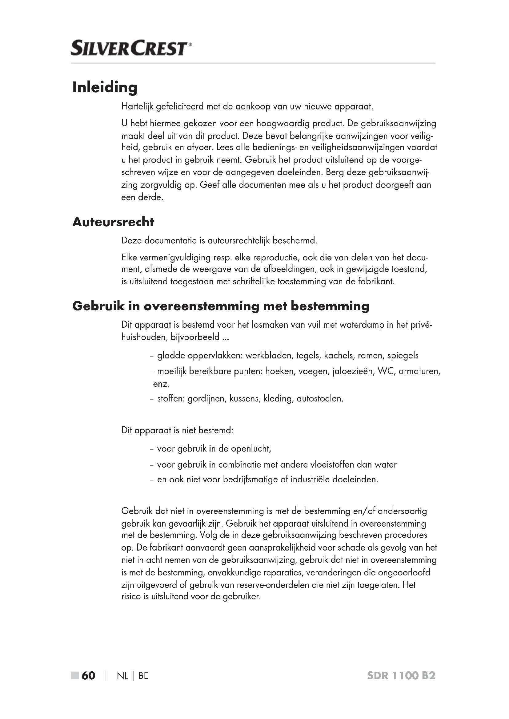 SDR 1100 B2 Inleiding Hartelijk gefeliciteerd met de aankoop van uw nieuwe apparaat. U hebt hiermee gekozen voor een hoogwaardig product. De gebruiksaanwijzing maakt deel uit van dit product. Deze bevat belangrijke aanwijzingen voor veilig- heid, gebruik en afvoer. Lees alle bedienings- en veiligheidsaanwijzingen voordat u het product in gebruik neemt. Gebruik het product uitsluitend op de voorge- schreven wijze en voor de aangegeven doeleinden. Berg deze gebruiksaanwij- zing zorgvuldig op. Geef alle documenten mee als u het product doorgeeft aan een derde. Auteursrecht Deze documentatie is auteursrechtelijk beschermd. Elke vermenigvuldiging resp. elke reproductie, ook die van delen van het docu- ment, alsmede de weergave van de afbeeldingen, ook in gewijzigde toestand, is uitsluitend toegestaan met schriftelijke toestemming van de fabrikant. Gebruik in overeenstemming met bestemming Dit apparaat is bestemd voor het losmaken van vuil met waterdamp in het privé- huishouden, bijvoorbeeld ... – gladde oppervlakken: werkbladen, tegels, kachels, ramen, spiegels – moeilijk bereikbare punten: hoeken, voegen, jaloezieën, WC, armaturen, enz. – stoffen: gordijnen, kussens, kleding, autostoelen. Dit apparaat is niet bestemd: – voor gebruik in de openlucht, – voor gebruik in combinatie met andere vloeistoffen dan water – en ook niet voor bedrijfsmatige of industriële doeleinden. Gebruik dat niet in overeenstemming is met de bestemming en/of andersoortig gebruik kan gevaarlijk zijn. Gebruik het apparaat uitsluitend in overeenstemming met de bestemming. Volg de in deze gebruiksaanwijzing beschreven procedures op. De fabrikant aanvaardt geen aansprakelijkheid voor schade als gevolg van het niet in acht nemen van de gebruiksaanwijzing, gebruik dat niet in overeenstemming is met de bestemming, onvakkundige reparaties, veranderingen die ongeoorloofd zijn uitgevoerd of gebruik van reserve-onderdelen die niet zijn toegelaten. Het risico is uitsluitend voor de gebruiker.NL