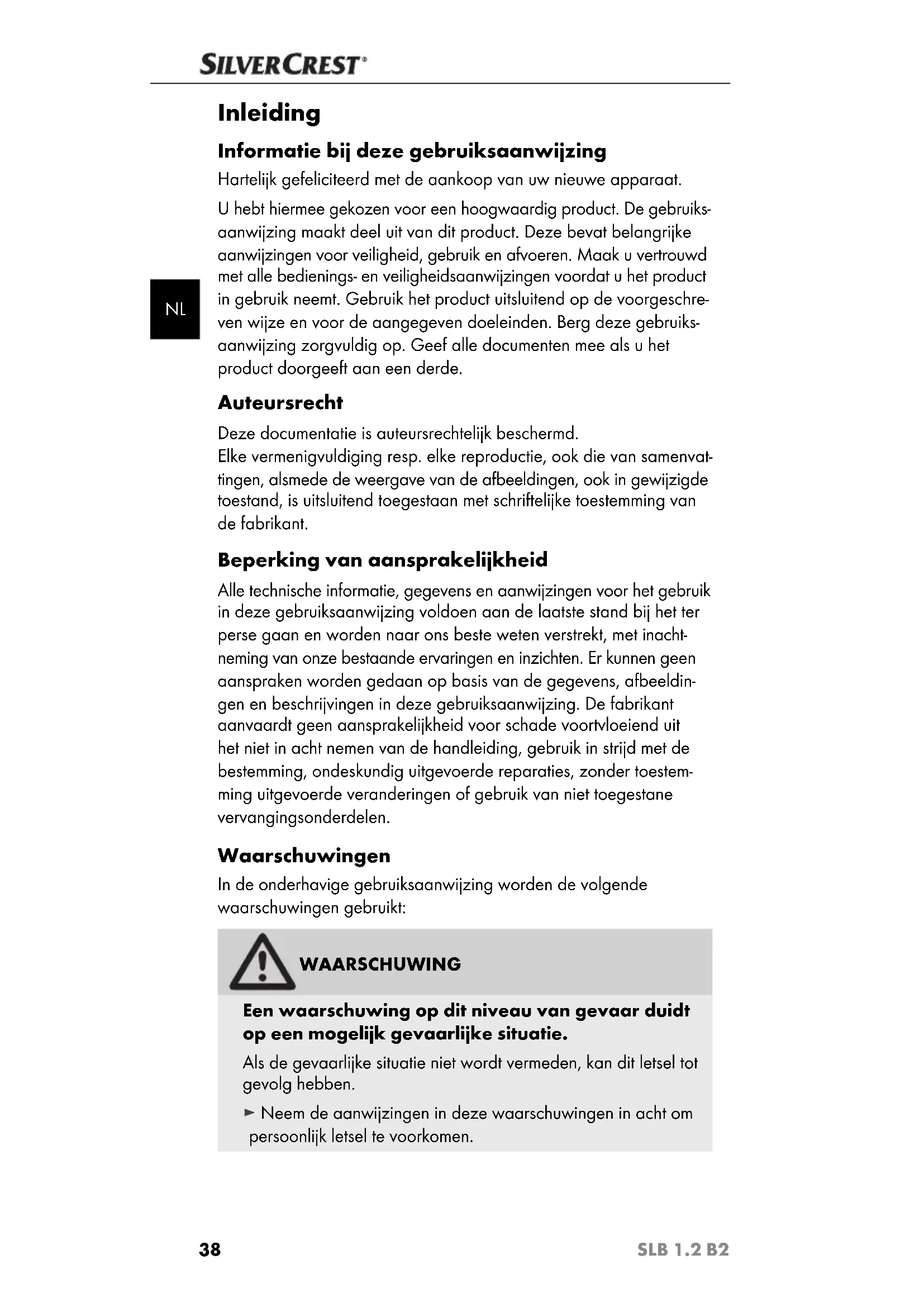 SLB 1.2 B2 Inleiding Informatie bij deze gebruiksaanwijzing Hartelijk gefeliciteerd met de aankoop van uw nieuwe apparaat. U hebt hiermee gekozen voor een hoogwaardig product. De gebruiks- aanwijzing maakt deel uit van dit product. Deze bevat belangrijke aanwijzingen voor veiligheid, gebruik en afvoeren. Maak u vertrouwd met alle bedienings- en veiligheidsaanwijzingen voordat u het product in gebruik neemt. Gebruik het product uitsluitend op de voorgeschre- ven wijze en voor de aangegeven doeleinden. Berg deze gebruiks- aanwijzing zorgvuldig op. Geef alle documenten mee als u het product doorgeeft aan een derde. Auteursrecht Deze documentatie is auteursrechtelijk beschermd. Elke vermenigvuldiging resp. elke reproductie, ook die van samenvat- tingen, alsmede de weergave van de afbeeldingen, ook in gewijzigde toestand, is uitsluitend toegestaan met schriftelijke toestemming van de fabrikant. Beperking van aansprakelijkheid Alle technische informatie, gegevens en aanwijzingen voor het gebruik in deze gebruiksaanwijzing voldoen aan de laatste stand bij het ter perse gaan en worden naar ons beste weten verstrekt, met inacht- neming van onze bestaande ervaringen en inzichten. Er kunnen geen aanspraken worden gedaan op basis van de gegevens, afbeeldin- gen en beschrijvingen in deze gebruiksaanwijzing. De fabrikant aanvaardt geen aansprakelijkheid voor schade voortvloeiend uit het niet in acht nemen van de handleiding, gebruik in strijd met de bestemming, ondeskundig uitgevoerde reparaties, zonder toestem- ming uitgevoerde veranderingen of gebruik van niet toegestane vervangingsonderdelen. Waarschuwingen In de onderhavige gebruiksaanwijzing worden de volgende waarschuwingen gebruikt: WAARSCHUWING Een waarschuwing op dit niveau van gevaar duidt op een mogelijk gevaarlijke situatie. Als de gevaarlijke situatie niet wordt vermeden, kan dit letsel tot gevolg hebben. ► Neem de aanwijzingen in deze waarschuwingen in acht om persoonlijk letsel te voorkomen. IB_89655_SLB1.2B2_LB1.indb 38IB_89655_SLB1.2B2_LB1.indb 38 16.05.13 11:0216.05.13 11:0239 SLB 1.2 B2