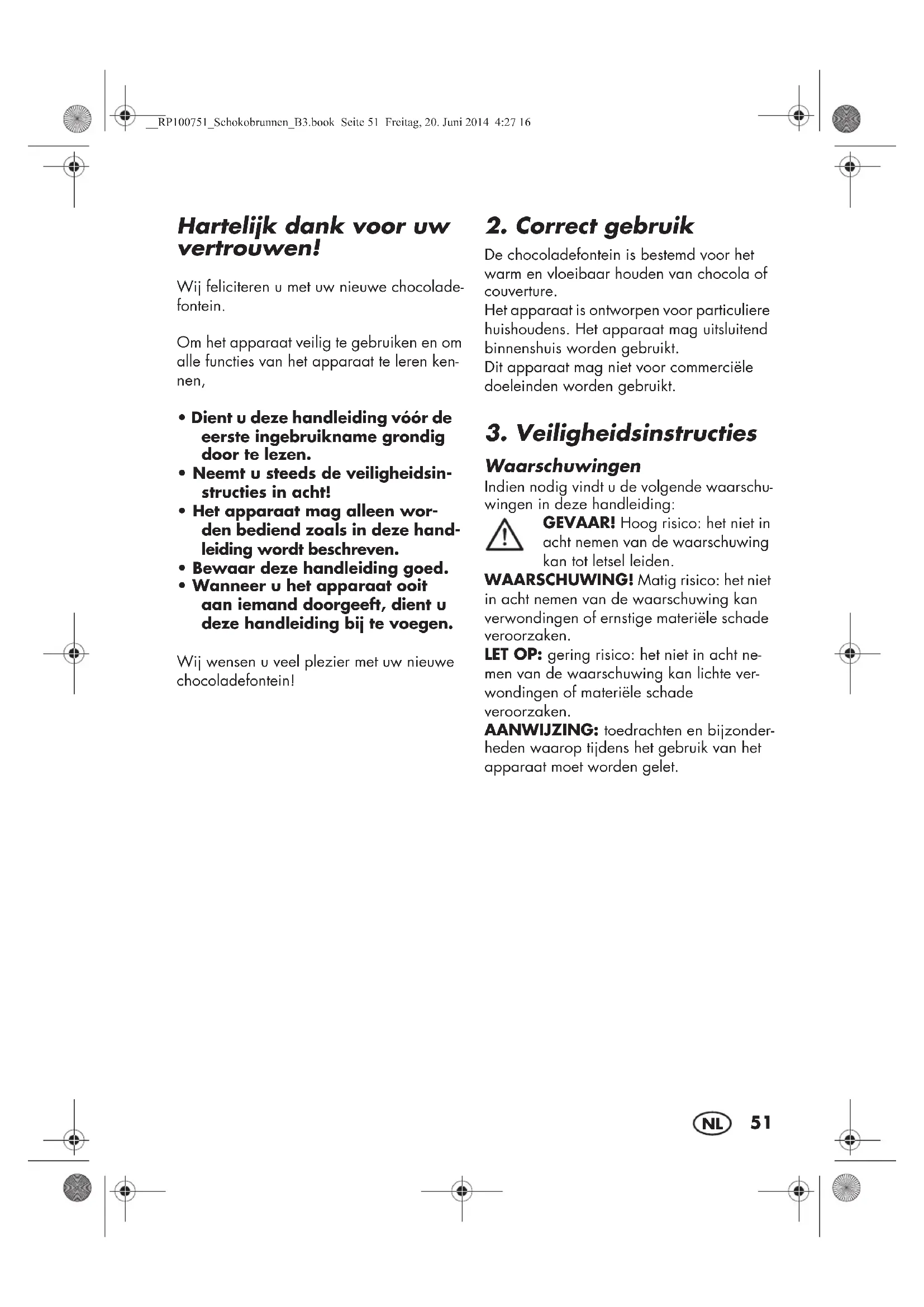 Waarschuwingen Indien nodig vindt u de volgende waarschu- wingen in deze handleiding: GEVAAR! Hoog risico: het niet in acht nemen van de waarschuwing kan tot letsel leiden. WAARSCHUWING! Matig risico: het niet in acht nemen van de waarschuwing kan verwondingen of ernstige materiële schade veroorzaken. LET OP: gering risico: het niet in acht ne- men van de waarschuwing kan lichte ver- wondingen of materiële schade veroorzaken. AANWIJZING: toedrachten en bijzonder- heden waarop tijdens het gebruik van het apparaat moet worden gelet. __RP100751_Schokobrunnen_B3.book Seite 51 Freitag, 20. Juni 2014 4:27 1652
