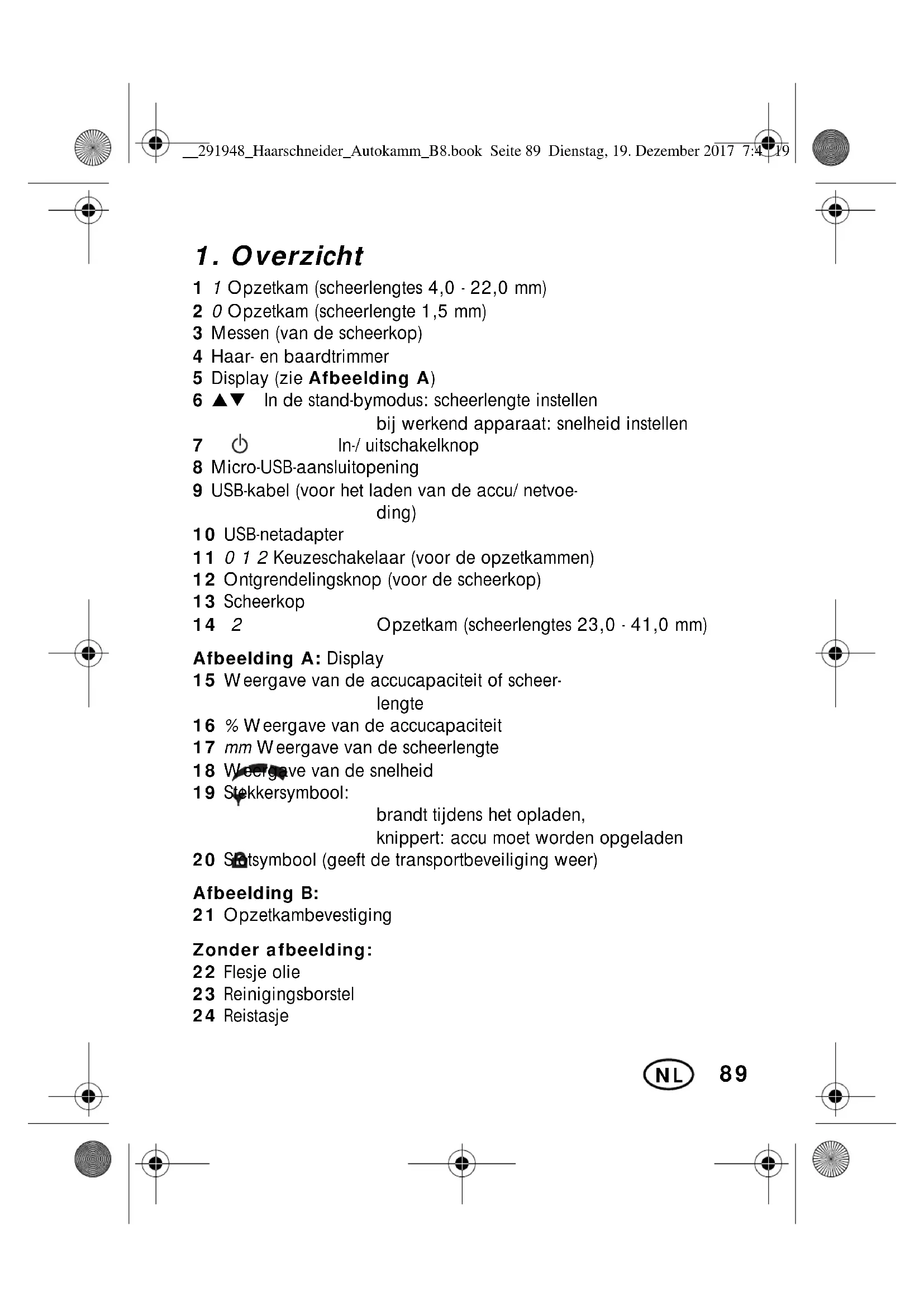 1 1 Opzetkam (scheerlengtes 4,0 - 22,0 mm) 2 0 Opzetkam (scheerlengte 1,5 mm) 3 Messen (van de scheerkop) 4 Haar- en baardtrimmer 5 Display (zie Afbeelding A) 6 ST In de stand-bymodus: scheerlengte instellen bij werkend apparaat: snelheid instellen 7 In-/uitschakelknop 8 Micro-USB-aansluitopening 9 USB-kabel (voor het laden van de accu/netvoe- ding) 10 USB-netadapter 11 0 1 2 Keuzeschakelaar (voor de opzetkammen) 12 Ontgrendelingsknop (voor de scheerkop) 13 Scheerkop 14 2 Opzetkam (scheerlengtes 23,0 - 41,0 mm) Afbeelding A: Display 15 Weergave van de accucapaciteit of scheer- lengte 16 % Weergave van de accucapaciteit 17 mm Weergave van de scheerlengte 18 Weergave van de snelheid 19 Stekkersymbool: brandt tijdens het opladen, knippert: accu moet worden opgeladen 20 Slotsymbool (geeft de transportbeveiliging weer) Afbeelding B: 21 Opzetkambevestiging Zonder afbeelding: 22 Flesje olie 23 Reinigingsborstel 24 Reistasje __291948_Haarschneider_Autokamm_B8.book Seite 89 Dienstag, 19. Dezember 2017 7:42 1990