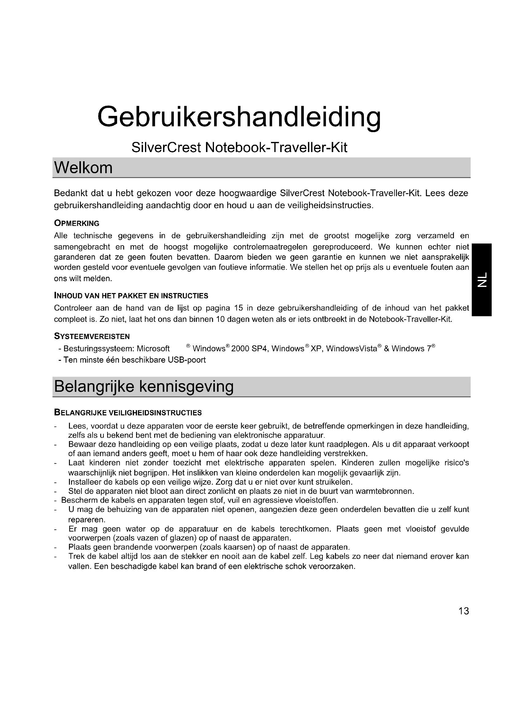 Gebruikershandleiding SilverCrest Notebook-Traveller-Kit Welkom Bedankt dat u hebt gekozen voor deze hoogwaardige SilverCrest Notebook-Traveller-Kit. Lees deze gebruikershandleiding aandachtig door en houd u aan de veiligheidsinstructies. OPMERKING Alle technische gegevens in de gebruikershandleiding zijn met de grootst mogelijke zorg verzameld en samengebracht en met de hoogst mogelijke controlemaatregelen gereproduceerd. We kunnen echter niet garanderen dat ze geen fouten bevatten. Daarom bieden we geen garantie en kunnen we niet aansprakelijk worden gesteld voor eventuele gevolgen van foutieve informatie. We stellen het op prijs als u eventuele fouten aan ons wilt melden. INHOUD VAN HET PAKKET EN INSTRUCTIES Controleer aan de hand van de lijst op pagina 15 in deze gebruikershandleiding of de inhoud van het pakket compleet is. Zo niet, laat het ons dan binnen 10 dagen weten als er iets ontbreekt in de Notebook-Traveller-Kit. SYSTEEMVEREISTEN - Besturingssysteem: Microsoft Windows 2000 SP4, Windows XP, WindowsVista & Windows 7