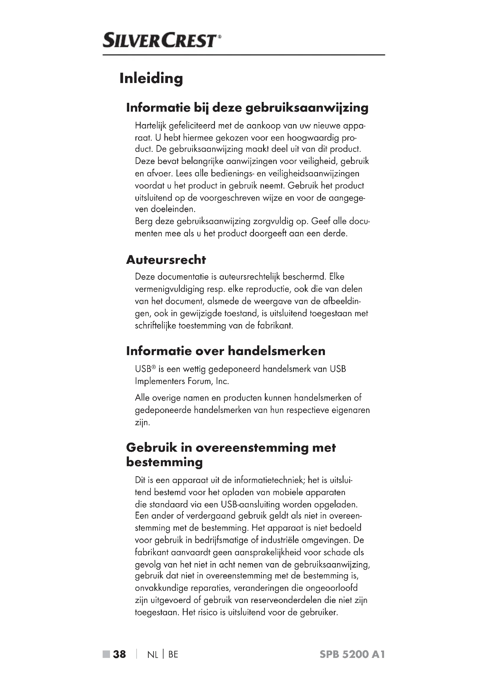 SPB 5200 A1 Inleiding Informatie bij deze gebruiksaanwijzing Hartelijk gefeliciteerd met de aankoop van uw nieuwe appa- raat. U hebt hiermee gekozen voor een hoogwaardig pro- duct. De gebruiksaanwijzing maakt deel uit van dit product. Deze bevat belangrijke aanwijzingen voor veiligheid, gebruik en afvoer. Lees alle bedienings- en veiligheidsaanwijzingen voordat u het product in gebruik neemt. Gebruik het product uitsluitend op de voorgeschreven wijze en voor de aangege- ven doeleinden. Berg deze gebruiksaanwijzing zorgvuldig op. Geef alle docu- menten mee als u het product doorgeeft aan een derde. Auteursrecht Deze documentatie is auteursrechtelijk beschermd. Elke vermenigvuldiging resp. elke reproductie, ook die van delen van het document, alsmede de weergave van de afbeeldin- gen, ook in gewijzigde toestand, is uitsluitend toegestaan met schriftelijke toestemming van de fabrikant. Informatie over handelsmerken USB
