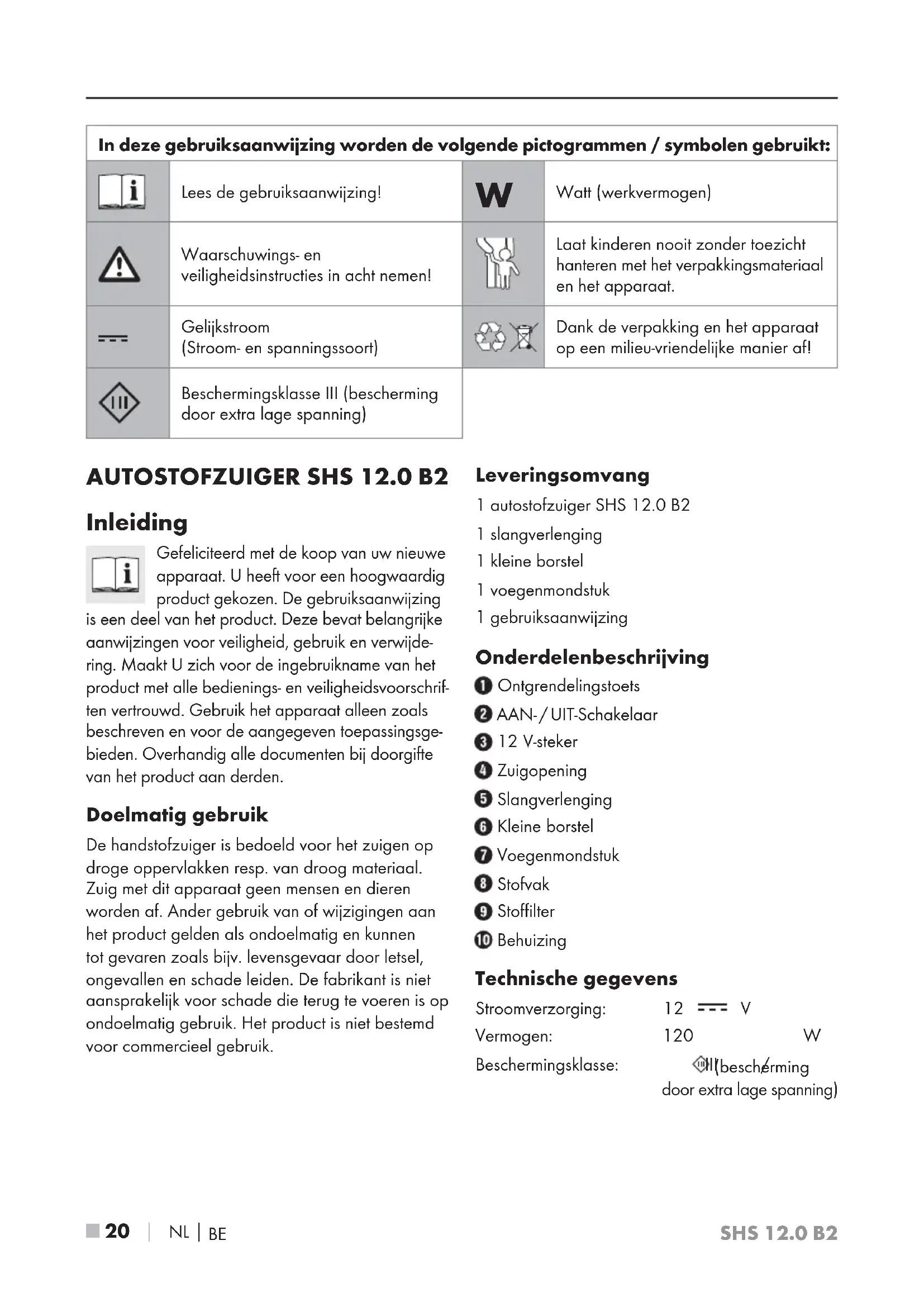 Inleiding Gefeliciteerd met de koop van uw nieuwe apparaat. U heeft voor een hoogwaardig product gekozen. De gebruiksaanwijzing is een deel van het product. Deze bevat belangrijke aanwijzingen voor veiligheid, gebruik en verwijde- ring. Maakt U zich voor de ingebruikname van het product met alle bedienings- en veiligheidsvoorschrif- ten vertrouwd. Gebruik het apparaat alleen zoals beschreven en voor de aangegeven toepassingsge- bieden. Overhandig alle documenten bij doorgifte van het product aan derden. Doelmatig gebruik De handstofzuiger is bedoeld voor het zuigen op droge oppervlakken resp. van droog materiaal. Zuig met dit apparaat geen mensen en dieren worden af. Ander gebruik van of wijzigingen aan het product gelden als ondoelmatig en kunnen tot gevaren zoals bijv. levensgevaar door letsel, ongevallen en schade leiden. De fabrikant is niet aansprakelijk voor schade die terug te voeren is op ondoelmatig gebruik. Het product is niet bestemd voor commercieel gebruik. Leveringsomvang 1 autostofzuiger SHS 12.0 B2 1 slangverlenging 1 kleine borstel 1 voegenmondstuk 1 gebruiksaanwijzing Onderdelenbeschrijving Ontgrendelingstoets AAN- / UIT-Schakelaar 12 V-steker Zuigopening Slangverlenging Kleine borstel Voegenmondstuk Stofvak Stoffilter Behuizing Technische gegevens Stroomverzorging: 12 V Vermogen: 120 W Beschermingsklasse: III / (bescherming door extra lage spanning) In deze gebruiksaanwijzing worden de volgende pictogrammen / symbolen gebruikt: Lees de gebruiksaanwijzing!