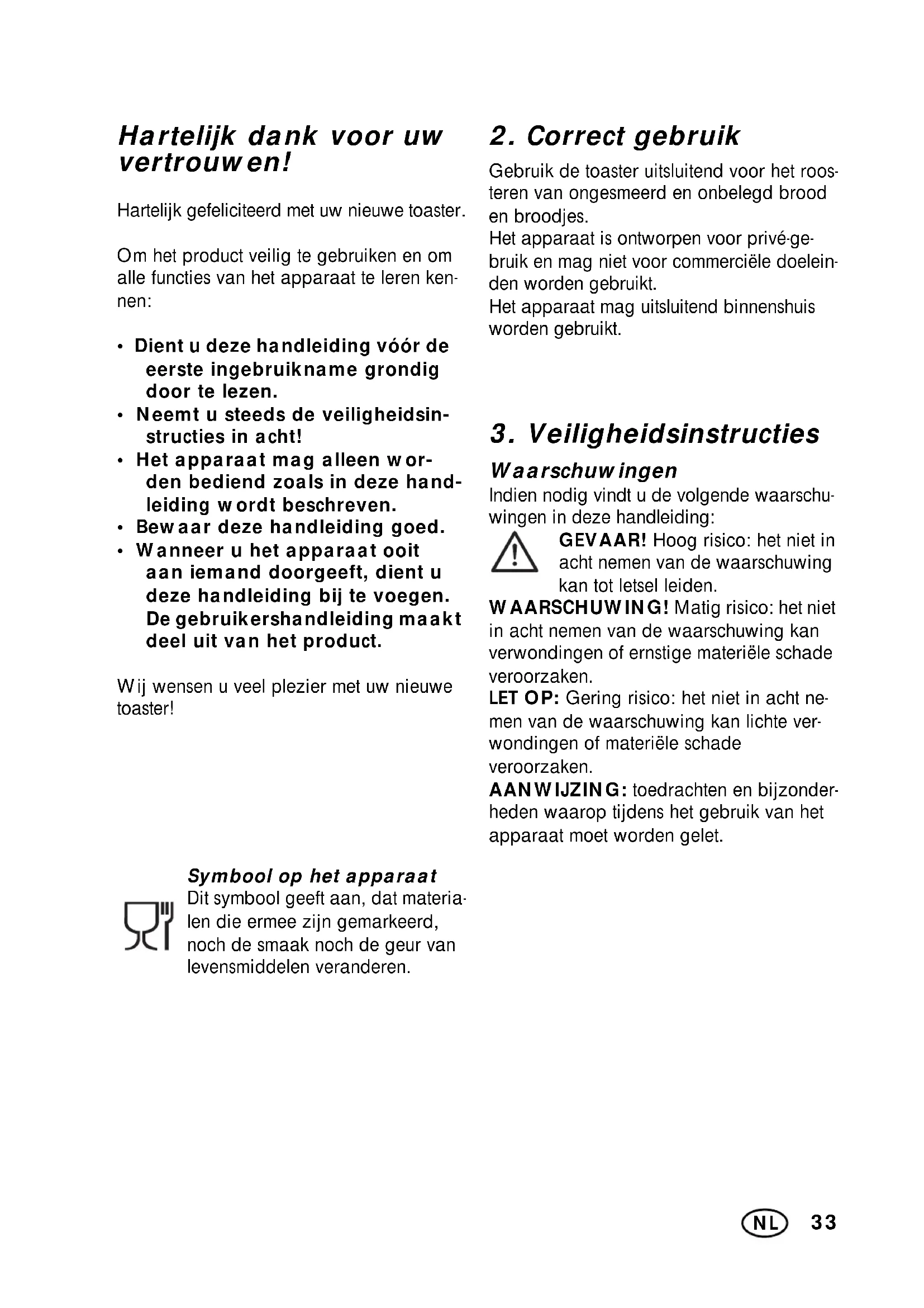 - Wanneer u het apparaat ooit aan iemand doorgeeft, dient u deze handleiding bij te voegen. De gebruikershandleiding maakt deel uit van het product. Wij wensen u veel plezier met uw nieuwe toaster! Symbool op het apparaat Dit symbool geeft aan, dat materia- len die ermee zijn gemarkeerd, noch de smaak noch de geur van levensmiddelen veranderen.