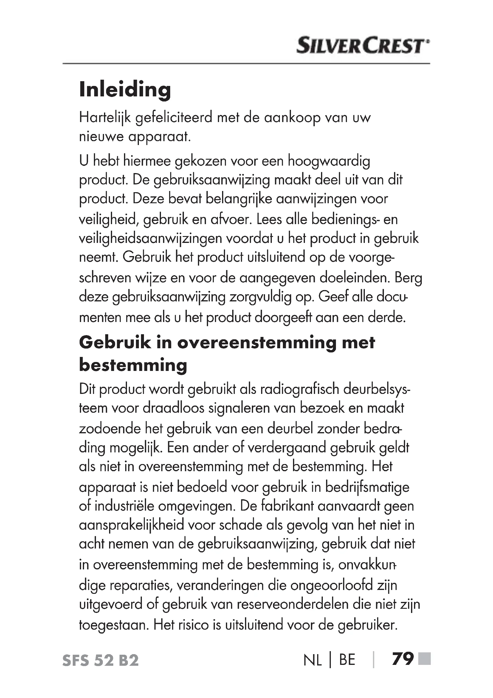 Ingebruikname Inhoud van het pakket controleren (afbeeldingen: zie uitvouwpagina) Het pakket bestaat uit de volgende onderdelen: ● 1 x ontvanger ● 1 x zender ● 1 x 3V-batterij type CR 2032 ● 5 x naamplaatje ● 2 x plug met schroef voor de montage van de zender ● 1 x dubbelzijdige plakband voor montage van de zender ● Deze gebruiksaanwijzing ♦ Haal alle onderdelen van het apparaat uit de ver- pakking en verwijder alle verpakkingsmateriaal. ♦ Controleer of het pakket compleet is en of er sprake is van zichtbare schade. ♦ Neem contact op met de Service-Hotline (zie hoofdstuk Service) als het pakket niet compleet is, of indien er sprake is van schade door gebrek- kige verpakking of transport.SFS 52 B2
