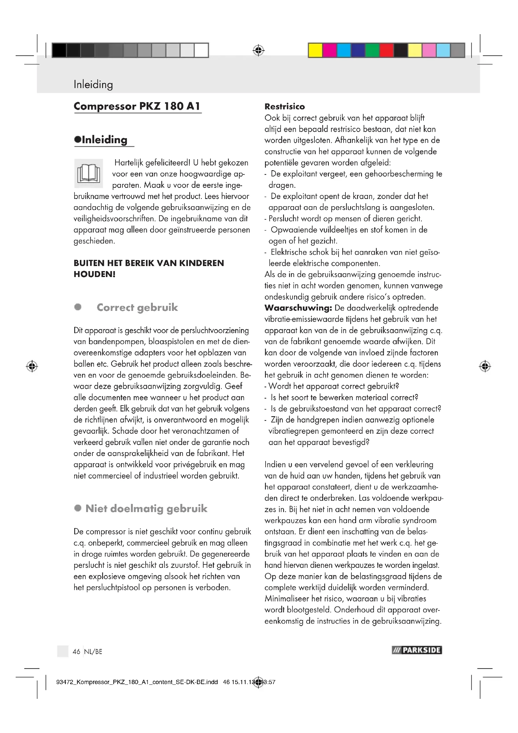 reren. Op deze wijze wordt gewaarborgd dat de veiligheid van het apparaat behouden blijft. Houd kinderen en andere personen tijdens het gebruik buiten het bereik van het apparaat. In geval van afleiding kunt u de controle over het apparaat verliezen. Draag geschikte kleding. Draag geen wijde kleding of sieraden. Houd haren, kleding en handschoenen uit de buurt van bewegende onderdelen. Los zittende kleding, sieraden of haren kunnen door bewegende onderdelen wordt ingetrokken. Aan- / uitschakelaar en apparaat wegleggen als de compressor onverwacht uitvalt. Gebruik indien mogelijk een condensaataf- scheider of leeg regelmatig de condens (water) uit de slangen en buizen voor en tijdens het gebruik van luchtdrukapparaten. LET OP! Een te klein persluchtsysteem kan de effectiviteit van uw apparaat verminderen. Richt het persluchtapparaat nooit op uzelf, andere personen of dieren. Anders bestaat gevaar op lichamelijk letsel. Let op alle op de compressor aangebrachte veiligheidsaanwijzingen. Zorg ervoor dat de zuigopening van de com- pressor altijd ongehinderd lucht kan inzuigen. Schakel het apparaat uit en trek de stekker uit het stopcontact om zo een ongewenste active- ring uit te sluiten. Laat u tijdens het werken met het apparaat niet afleiden. Let er alstublieft op, dat u de compressor niet bij een temperatuur van minder dan 5 °C ge- bruikt. De contactdoos moet te allen tijde bereikbaar zijn. LET OP! De manometer is niet geijkt! Contro- leer de luchtdruk na het vullen met behulp van een geijkt apparaat. 93472_Kompressor_PKZ_180_A1_content_SE-DK-BE.indd 49 15.11.13 13:5750 NL/BE Algemene veiligheidsinstructies voor elektro-apparaten / Voor de ingebruikname Algemene veiligheidsinstructies voor elektro-apparaten Sluit het apparaat alleen met een foutstroom- begrenzer (FI) beschermingsschakelaar aan. Bescherm uzelf tegen een elektrische schok. Vermijd het om tijdens het werken geaarde delen (zoals bijv. een koelkast, waterleidingen, etc.) aan te raken.