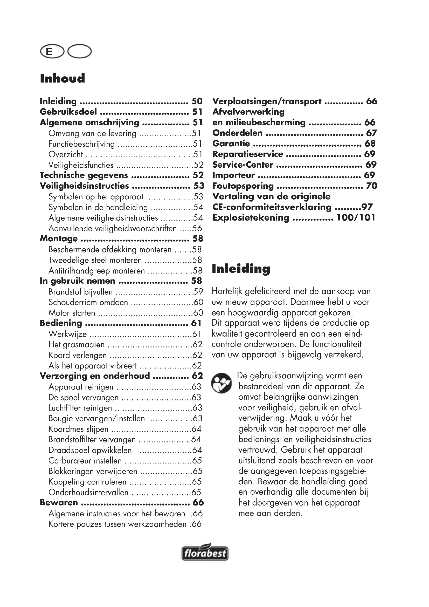 - De gehele gebruiksaanwzing moet voor het gebruik worden doorgelezen. Het niet nakomen van de gebruiksaan- wzing kan levensgevaarlk zn! Lees de gebruiksaanwzing van het apparaat voor gebruik aan- dachtig door. Draag een veiligheidsbril. Draag een hoofdbescherming. Draag een gehoorbescherming. Draag veiligheidshandschoenen. Gevaar door sndwonden! Draag veiligheidsschoenen met stevige zolen. Let op dat de maaikop b het starten en tdens het werken met de trimmer niet in aanraking komt met externe elementen. Neem een gevarenzone van mi- nimaal 15 m aan. Gevaar door weggeslingerde stukken! Houd andere personen op een veilige afstand. Opgelet! Brandstof en brand- stofdampen zijn ontvlambaar. Brand- en explosiegevaar! Opgelet! Werk uitsluitend met een draadspoel. Gebruik geen metalen snoei- blad of zaagblad. Gevaar voor verwondingen! Let op! Hete oppervlakken, kans op brandwonden! Geluidssterkte L