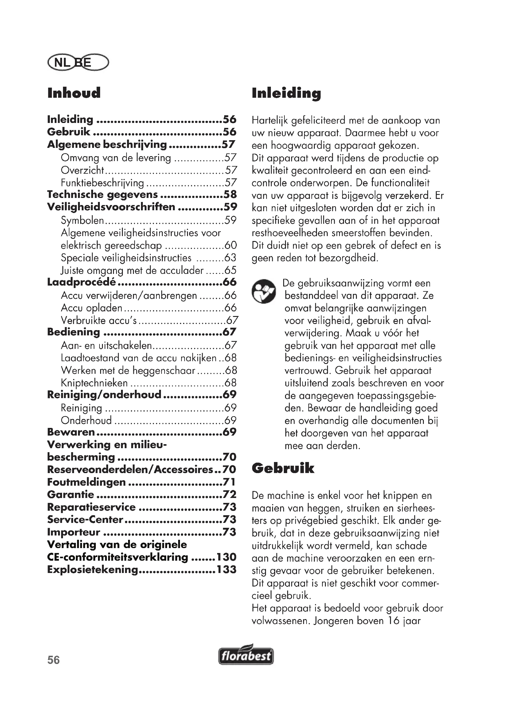- De effectieve inschakelduur van een vol- ledig geladen accu onder belasting hangt van de werkwjze en van de belasting tjdens het snoeien af. Geluids- en vibratiewaarden werden volgens de in de conformiteitverklaring genoemde normen en bepalingen vastge- steld. Technische en optische veranderingen kun- nen in het kader van ontwikkelingen zon- der aankondiging worden uitgevoerd. Alle maten, richtljnen en gegevens van deze gebruiksaanwjzing zjn daarom onder voorbehoud. Wetteljke aansprakeljkheid, die op basis van de gebruiksaanwjzing wordt gesteld, kan daardoor niet geldig worden gemaakt. De aangegeven trillingemissiewaarde werd volgens een genormaliseerd testme- thode gemeten en kan ter vergeljking van een stuk elektrisch gereedschap met een ander gebruikt worden. De aangegeven trillingemissiewaarde kan ook voor een inleidende inschatting van de blootstelling benut worden. Waarschuwing: Afhankeljk van de manier, waarop het elektrische gereedschap ge- bruikt wordt, kan de trilingemis- siewaarde tjdens het effectieve gebruik van het elektrische gereed- schap van de aangegeven waarde verschillen. De noodzaak bestaat, veiligheids- maatregelen ter bescherming van de operator vast te leggen, die op een inschatting van de blootstelling in de effectieve gebruiksomstan- digheden gebaseerd zjn (hierbj moet er met alle aandelen van de bedrjfscyclus rekening gehouden worden, zo bjvoorbeeld met tjden, tjdens dewelke het elektrische gereedschap uitgeschakeld is, en tjden, tjdens dewelke het welis- waar ingeschakeld is, maar zonder belasting functioneert).59 NL BE Veiligheidsvoorschriften Deze paragraaf behandelt de fundamen- tele veiligheidsvoorschriften bj het werk met het apparaat. Symbolen Symbolen op het apparaat Let op! Lees alvorens het apparaat te gebruiken de gebruiksaanwjzing door. Draag oog- en gehoorbescherming. Gebruik de heggenschaar niet als het regent of als de heg nat is.