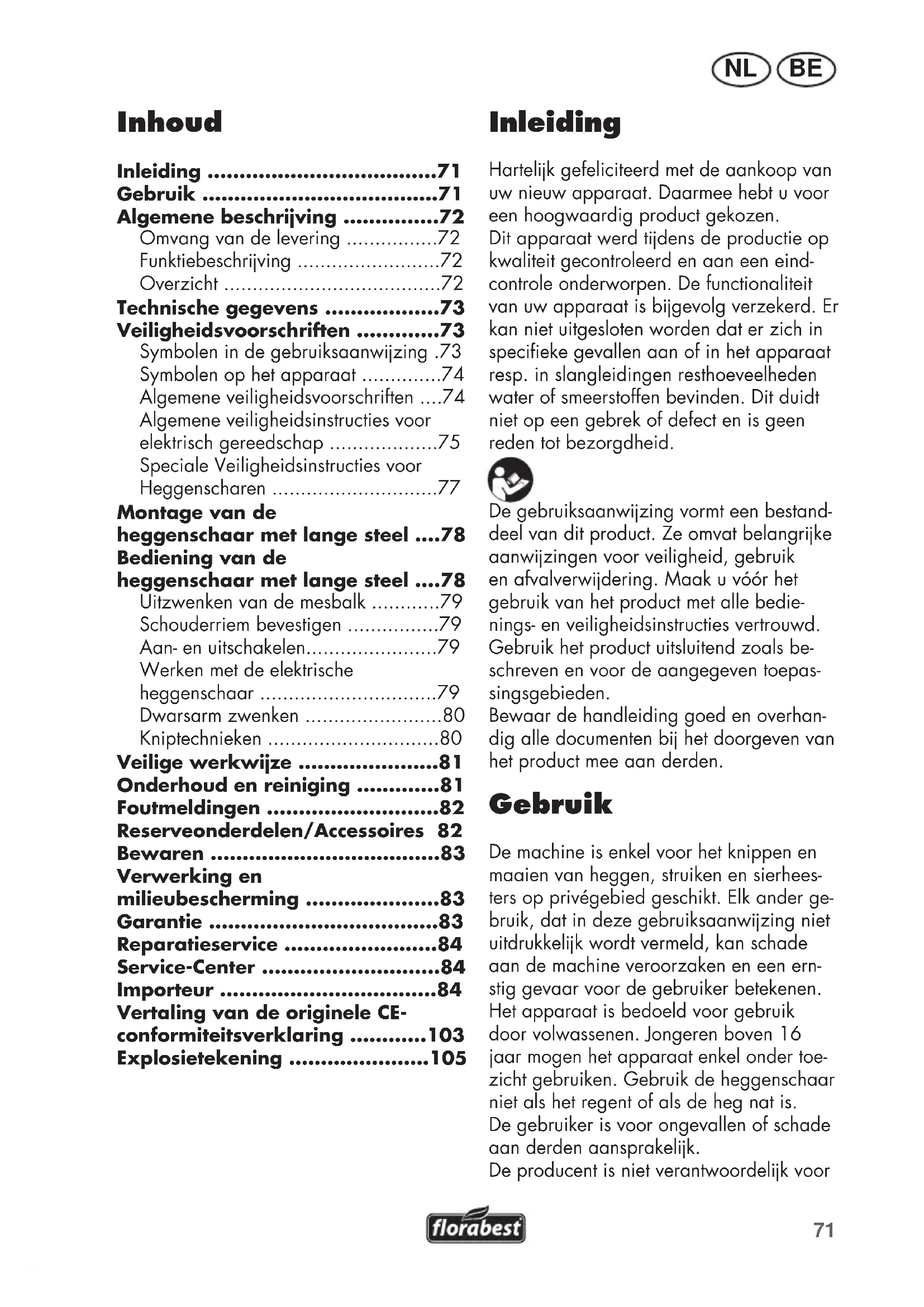 - Explosietekening Inleiding Hartelk gefeliciteerd met de aankoop van uw nieuw apparaat. Daarmee hebt u voor een hoogwaardig product gekozen. Dit apparaat werd tdens de productie op kwaliteit gecontroleerd en aan een eind- controle onderworpen. De functionaliteit van uw apparaat is bgevolg verzekerd. Er kan niet uitgesloten worden dat er zich in specieke gevallen aan of in het apparaat resp. in slangleidingen resthoeveelheden water of smeerstoffen bevinden. Dit duidt niet op een gebrek of defect en is geen reden tot bezorgdheid. De gebruiksaanwzing vormt een bestand- deel van dit product. Ze omvat belangrke aanwzingen voor veiligheid, gebruik en afvalverwdering. Maak u vóór het gebruik van het product met alle bedie- nings- en veiligheidsinstructies vertrouwd. Gebruik het product uitsluitend zoals be- schreven en voor de aangegeven toepas- singsgebieden. Bewaar de handleiding goed en overhan- dig alle documenten b het doorgeven van het product mee aan derden. Gebruik De machine is enkel voor het knippen en maaien van heggen, struiken en sierhees- ters op privégebied geschikt. Elk ander ge- bruik, dat in deze gebruiksaanwzing niet uitdrukkelk wordt vermeld, kan schade aan de machine veroorzaken en een ern- stig gevaar voor de gebruiker betekenen. Het apparaat is bedoeld voor gebruik door volwassenen. Jongeren boven 16 jaar mogen het apparaat enkel onder toe- zicht gebruiken. Gebruik de heggenschaar niet als het regent of als de heg nat is. De gebruiker is voor ongevallen of schade aan derden aansprakelk. De producent is niet verantwoordelk voor72 p. 105