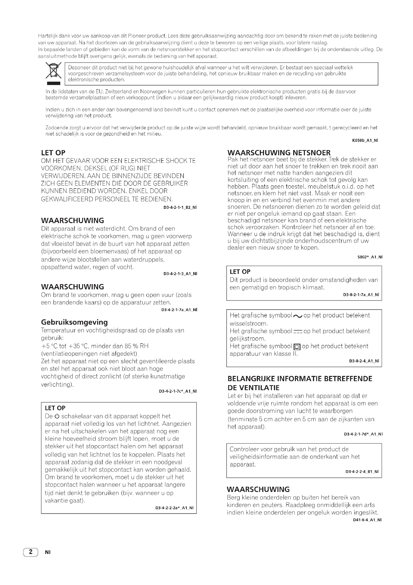 Hartelijk dank voor uw aankoop van dit Pioneer product. Lees deze gebruiksaanwijzing aandachtig door om bekend te raken met de juiste bediening van uw apparaat. Na het doorlezen van de gebruiksaanwijzing dient u deze te bewaren op een veilige plaats, voor latere naslag. In bepaalde landen of gebieden kan de vorm van de netsnoerstekker en het stopcontact verschillen van de afbeeldingen bij de onderstaande uitleg. De aansluitmethode blijft overigens gelijk, evenals de bediening van het apparaat. Deponeer dit product niet bij het gewone huishoudelijk afval wanneer u het wilt verwijderen. Er bestaat een speciaal wettelijk voorgeschreven verzamelsysteem voor de juiste behandeling, het opnieuw bruikbaar maken en de recycling van gebruikte elektronische producten. In de lidstaten van de EU, Zwitserland en Noorwegen kunnen particulieren hun gebruikte elektronische producten gratis bij de daarvoor bestemde verzamelplaatsen of een verkooppunt (indien u aldaar een gelijkwaardig nieuw product koopt) inleveren. Indien u zich in een ander dan bovengenoemd land bevindt kunt u contact opnemen met de plaatselijke overheid voor informatie over de juiste verwijdering van het product. Zodoende zorgt u ervoor dat het verwijderde product op de juiste wijze wordt behandeld, opnieuw bruikbaar wordt gemaakt, t gerecycleerd en het niet schadelijk is voor de gezondheid en het milieu. K058b_A1_Nl LET OP OM HET GEVAAR VOOR EEN ELEKTRISCHE SHOCK TE