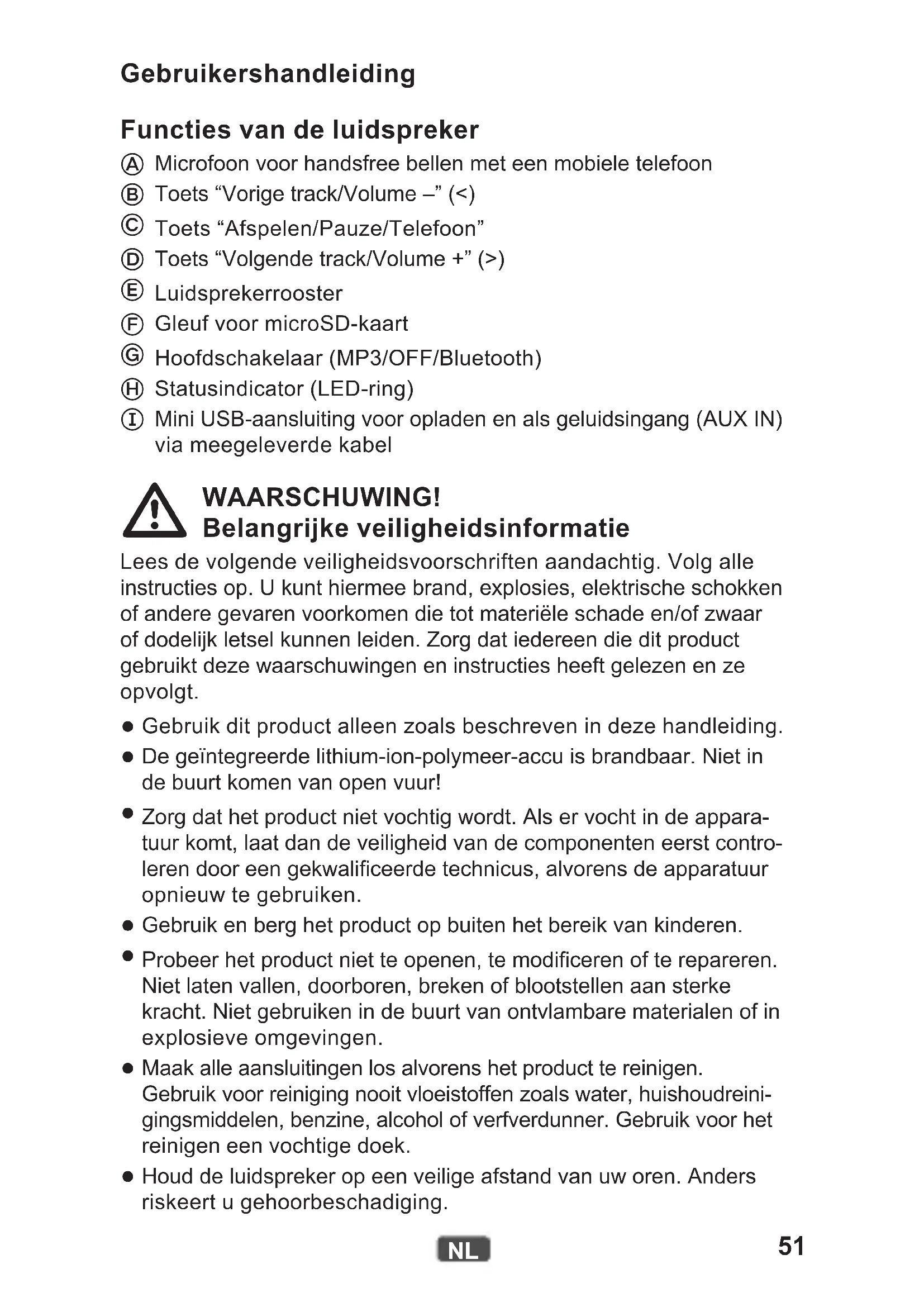 Mini USB-aansluiting voor opladen en als geluidsingang (AUX IN) via meegeleverde kabel WAARSCHUWING! Belangrijke veiligheidsinformatie Lees de volgende veiligheidsvoorschriften aandachtig. Volg alle instructies op. U kunt hiermee brand, explosies, elektrische schokken of andere gevaren voorkomen die tot materiële schade en/of zwaar of dodelijk letsel kunnen leiden. Zorg dat iedereen die dit product gebruikt deze waarschuwingen en instructies heeft gelezen en ze opvolgt.