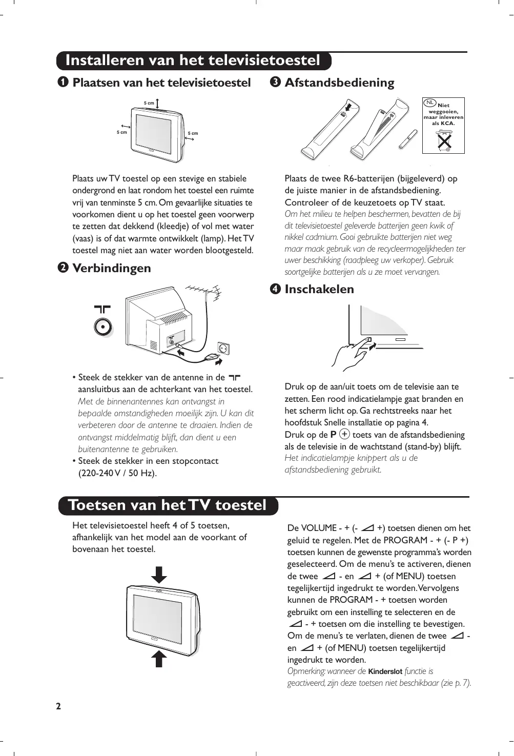 Installeren van het televisietoestel & Plaatsen van het televisietoestel “ Afstandsbediening Niet weggooien, maar inleveren als KCA. 5 cm 5 cm 5 cm Plaats uw TV toestel op een stevige en stabiele ondergrond en laat rondom het toestel een ruimte vrij van tenminste 5 cm. Om gevaarlijke situaties te voorkomen dient u op het toestel geen voorwerp te zetten dat dekkend (kleedje) of vol met water (vaas) is of dat warmte ontwikkelt (lamp). Het TV toestel mag niet aan water worden blootgesteld. é Verbindingen Plaats de twee R6-batterijen (bijgeleverd) op de juiste manier in de afstandsbediening. Controleer of de keuzetoets op TV staat. Om het milieu te helpen beschermen, bevatten de bij dit televisietoestel geleverde batterijen geen kwik of nikkel cadmium. Gooi gebruikte batterijen niet weg maar maak gebruik van de recycleermogelijkheden ter uwer beschikking (raadpleeg uw verkoper). Gebruik soortgelijke batterijen als u ze moet vervangen. ‘ Inschakelen