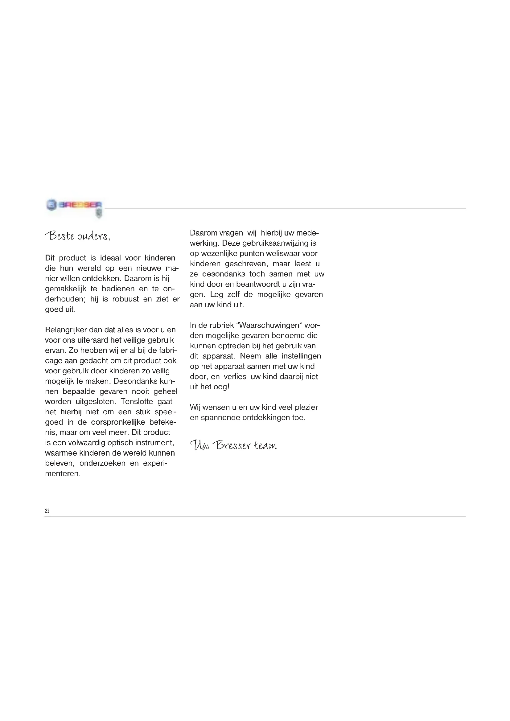 Beste jonge ontdekker! Beste jonge ontdekster! Je hebt dit product gekocht (of ca- deau gekregen) waarmee ik je wil feliciteren. Bij het lezen van deze gebruiksaan- wijzing zal je er beslist verbaasd van staan te kijken hoe veelzijdig je dit apparaat kunt gebruiken en hoeveel je er mee kunt ontdekken. Overtuig jezelf ervan en duik in de wereld van belevenissen en ontdek- kingen in de natuur. Je zult er enorm veel plezier in heb- ben en het heel spannend vinden om de wereld met dit product te er- varen. Voordat je het apparaat gaat gebrui- ken, moet je wel eerst deze gebruik- saanwijzing goed doorlezen. Er is na- melijk een aantal belangrijke punten die je moet weten, voordat je met je eerste waarnemingen begint. Lees alsjeblieft heel zorgvuldig de “waarschuwing“ door! Gebruik het product alleen zoals dat in deze ge- bruiksaanwijzing staat beschreven, zodat er niet per ongeluk letsel of schade optreedt. Bewaar deze ge- bruiksaanwijzing om later nog ‘ns na te lezen. Geef als je het apparaat aan iemand anders geeft of cadeau doet deze gebruiksaanwijzing er ook bij. En nu wens ik je veel plezier bij het onderzoeken en ontdekken! Je vriendin Pia24 GEVAAR voor uw kind! Bij het werken met dit ap- paraat worden vaak scherpe en puntige hulpmiddelen gebruikt. Bewaar dit apparaat daarom samen met alle onderdelen en hulpmiddelen op een plaats die niet voor kinderen toegankelijk is. Uw kind kan LETSEL oplopen! Dit apparaat bevat elektronische onderdelen die via een stroombron (stroomvoorziening of batterijen) wor- den aangedreven. Zorg dat kinderen tijdens de bediening altijd onder toe- zicht staan! Gebruik mag uitsluitend plaats vinden zoals in de gebruiks- aanwijzing staat omschreven, an- ders bestaat het GEVAAR van een ELEKTRISCHE SCHOK! Batterijen horen buiten het bereik van kinderen te blijven! Let bij het plaatsen van een batterij op de juiste richting (+/-). Lekkende of bescha- digde batterijen veroorzaken irritatie als ze met de huid in aanraking ko- men. Gebruik in dat geval geschikte handschoenen. Kinderen mogen het apparaat uitslui- tend onder toezicht gebruiken. Houdt het verpakkingsmateriaal (plastic zak- ken, elastiekjes, e.d.) buiten bereik van kinderen! Hierdoor kunnen ze STIKKEN! BRAND-/EXPLOSIEGEVAAR! Stel het apparaat niet bloot aan hoge temperaturen. Gebruik uitsluitend de meegeleverde adapter of de aanbevolen batterijen. Apparaat en batterijen niet kortsluiten en niet in open vuur gooien! Door overmatige hitte en onoordeelkundig gebruik kunnen kortsluiting, brand en zelfs explosies optreden! GEVAAR voor materiële schade! Demonteer het apparaat niet! Neem in alle situaties waarin zich een defect voordoet contact op met uw vakhandel. Hij neemt contact op met het servicecentrum en kan het apparaat indien nodig ter repara- tie opsturen. Stel het apparaat niet bloot aan tem- peraturen boven de 60ºC! TIPS voor het schoonmaken Ontkoppel het apparaat vóór het schoonmaken van de stroombron (stekker uit het stopcontact nemen of batterijen verwijderen)! Reinig het apparaat uitsluitend aan de buitenzijde met een droge doek. Gebruik geen reinigingsvloeistof om schade aan de elektronische onder- delen te voorkomen. Bescherm het apparaat tegen stof en vocht! Bewaar het in de meegele- verde tas of verpakking. De batterijen dienen uit het apparaat te worden25