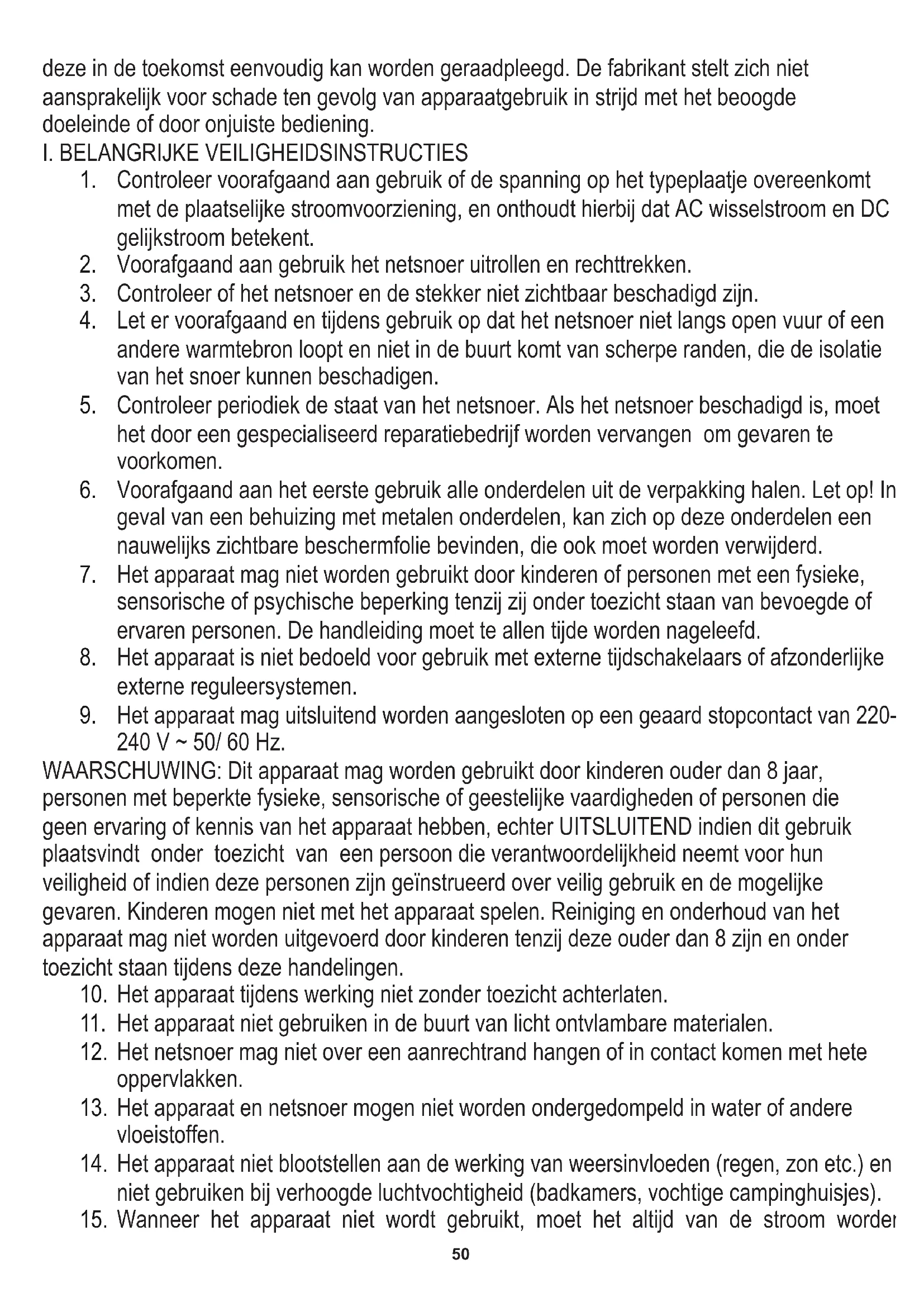 WAARSCHUWING: Dit apparaat mag worden gebruikt door kinderen ouder dan 8 jaar, personen met beperkte fysieke, sensorische of geestelijke vaardigheden of personen die geen ervaring of kennis van het apparaat hebben, echter UITSLUITEND indien dit gebruik plaatsvindt onder toezicht van een persoon die verantwoordelijkheid neemt voor hun veiligheid of indien deze personen zijn geïinstrueerd over veilig gebruik en de mogelijke gevaren. Kinderen mogen niet met het apparaat spelen. Reiniging en onderhoud van het apparaat mag niet worden uitgevoerd door kinderen tenzij deze ouder dan 8 zijn en onder toezicht staan tijdens deze handelingen.