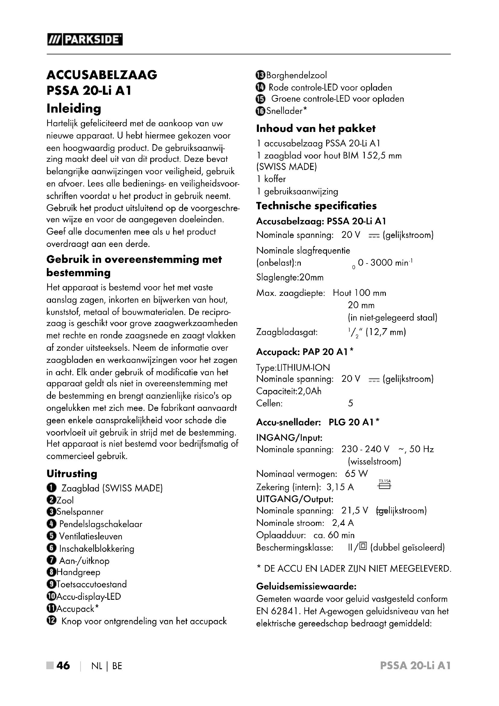 - DE ACCU EN LADER ZIJN NIET MEEGELEVERD. Geluidsemissiewaarde: Gemeten waarde voor geluid vastgesteld conform EN 62841. Het A-gewogen geluidsniveau van het elektrische gereedschap bedraagt gemiddeld:PSSA 20-Li A1 NL│BE │ 47 ■ Geluidsdrukniveau: L