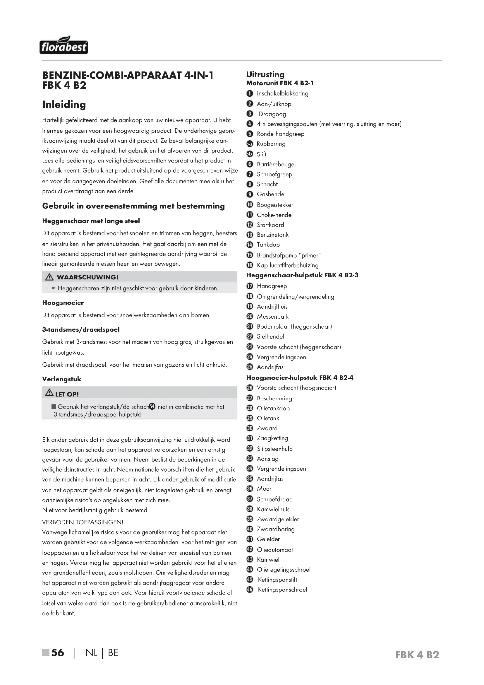 - Vertaling van de oorspronkelijke conformiteitsverklaring FBK 4 B2 ■ 56 │ NL│BE BENZINE-COMBI-APPARAAT 4-IN-1 FBK 4 B2 Inleiding Hartelijk gefeliciteerd met de aankoop van uw nieuwe apparaat. U hebt hiermee gekozen voor een hoogwaardig product. De onderhavige gebru- iksaanwijzing maakt deel uit van dit product. Ze bevat belangrijke aan- wijzingen over de veiligheid, het gebruik en het afvoeren van dit product. Lees alle bedienings- en veiligheidsvoorschriften voordat u het product in gebruik neemt. Gebruik het product uitsluitend op de voorgeschreven wijze en voor de aangegeven doeleinden. Geef alle documenten mee als u het product overdraagt aan een derde. Gebruik in overeenstemming met bestemming Heggenschaar met lange steel Dit apparaat is bestemd voor het snoeien en trimmen van heggen, heesters en sierstruiken in het privéhuishouden. Het gaat daarbij om een met de hand bediend apparaat met een geïntegreerde aandrijving waarbij de lineair gemonteerde messen heen en weer bewegen. WAARSCHUWING! ► Heggenscharen zijn niet geschikt voor gebruik door kinderen. Hoogsnoeier Dit apparaat is bestemd voor snoeiwerkzaamheden aan bomen. 3-tandsmes/draadspoel Gebruik met 3-tandsmes: voor het maaien van hoog gras, struikgewas en licht houtgewas. Gebruik met draadspoel: voor het maaien van gazons en licht onkruid. Verlengstuk LET OP! ■ Gebruik het verlengstuk/de schacht p. 72