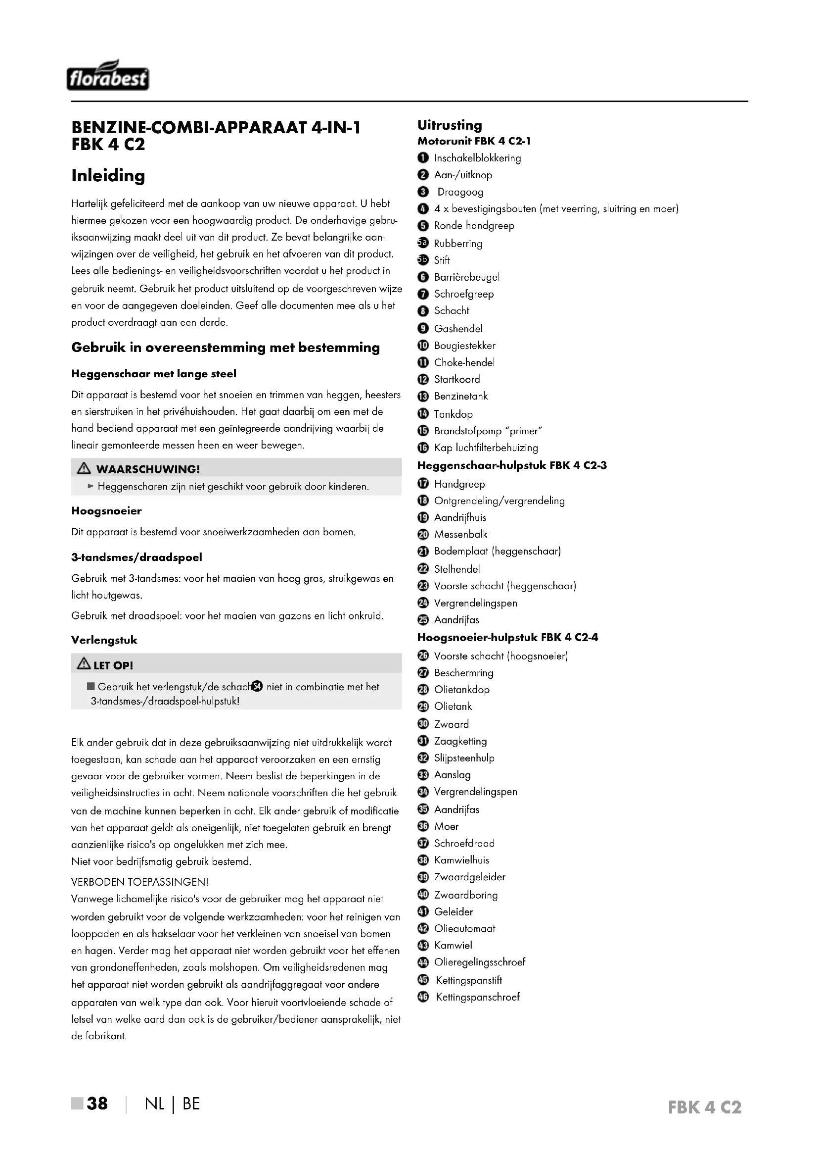 - Vertaling van de oorspronkelijke conformiteitsverklaring FBK 4 C2 ■ 38 │ NL│BE BENZINE-COMBI-APPARAAT 4-IN-1 FBK 4 C2 Inleiding Hartelijk gefeliciteerd met de aankoop van uw nieuwe apparaat. U hebt hiermee gekozen voor een hoogwaardig product. De onderhavige gebru- iksaanwijzing maakt deel uit van dit product. Ze bevat belangrijke aan- wijzingen over de veiligheid, het gebruik en het afvoeren van dit product. Lees alle bedienings- en veiligheidsvoorschriften voordat u het product in gebruik neemt. Gebruik het product uitsluitend op de voorgeschreven wijze en voor de aangegeven doeleinden. Geef alle documenten mee als u het product overdraagt aan een derde. Gebruik in overeenstemming met bestemming Heggenschaar met lange steel Dit apparaat is bestemd voor het snoeien en trimmen van heggen, heesters en sierstruiken in het privéhuishouden. Het gaat daarbij om een met de hand bediend apparaat met een geïntegreerde aandrijving waarbij de lineair gemonteerde messen heen en weer bewegen. WAARSCHUWING! ► Heggenscharen zijn niet geschikt voor gebruik door kinderen. Hoogsnoeier Dit apparaat is bestemd voor snoeiwerkzaamheden aan bomen. 3-tandsmes/draadspoel Gebruik met 3-tandsmes: voor het maaien van hoog gras, struikgewas en licht houtgewas. Gebruik met draadspoel: voor het maaien van gazons en licht onkruid. Verlengstuk LET OP! ■ Gebruik het verlengstuk/de schacht p. 54
