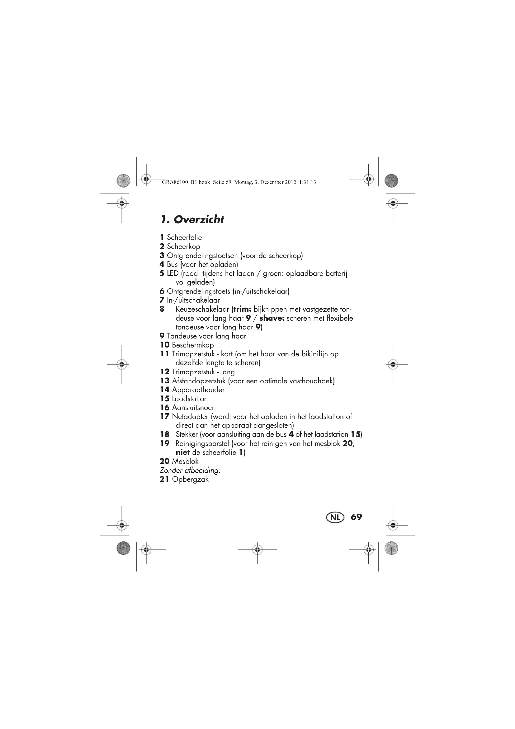 19 Reinigingsborstel (voor het reinigen van het mesblok20, niet de scheerfolie1) 20 Mesblok Zonder afbeelding: 21 Opbergzak __GRA86100_B1.book Seite 69 Montag, 3. Dezember 2012 1:31 1370