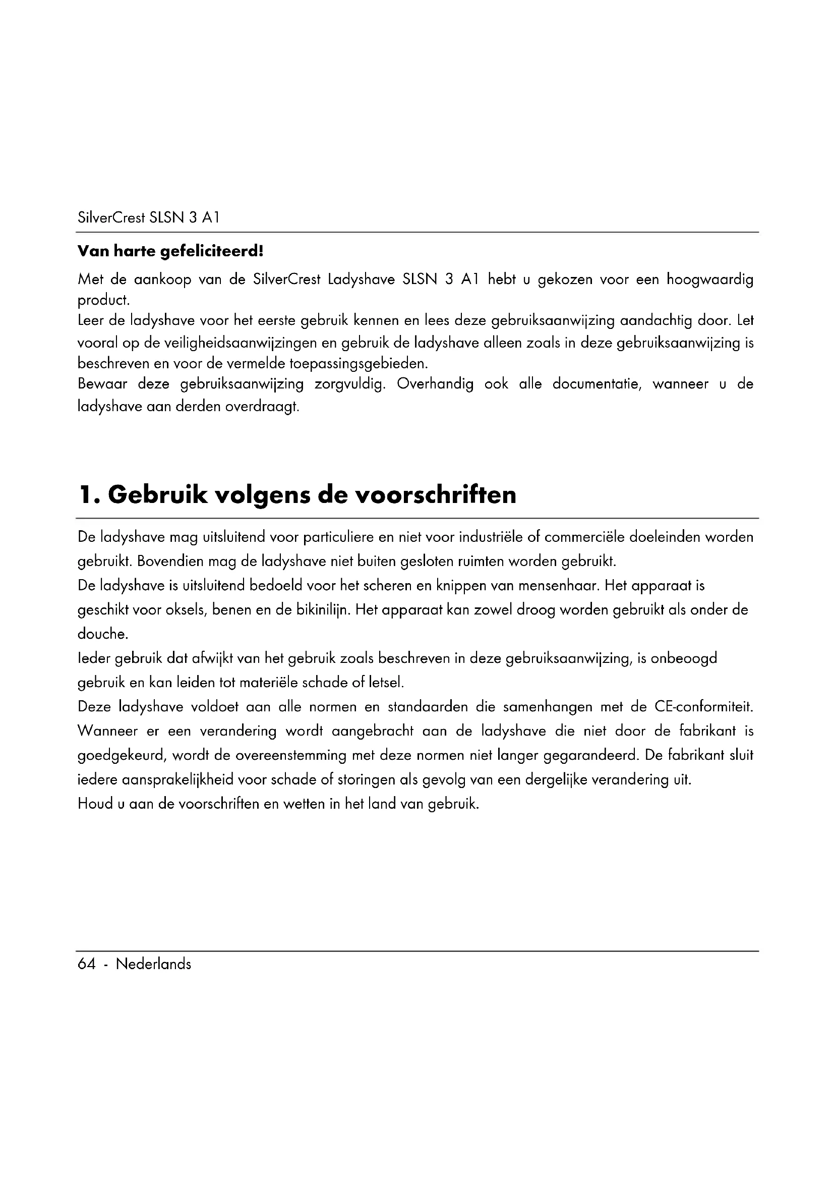 Van harte gefeliciteerd! Met de aankoop van de SilverCrest Ladyshave SLSN 3 A1 hebt u gekozen voor een hoogwaardig product. Leer de ladyshave voor het eerste gebruik kennen en lees deze gebruiksaanwijzing aandachtig door. Let vooral op de veiligheidsaanwijzingen en gebruik de ladyshave alleen zoals in deze gebruiksaanwijzing is beschreven en voor de vermelde toepassingsgebieden. Bewaar deze gebruiksaanwijzing zorgvuldig. Overhandig ook alle documentatie, wanneer u de ladyshave aan derden overdraagt.
