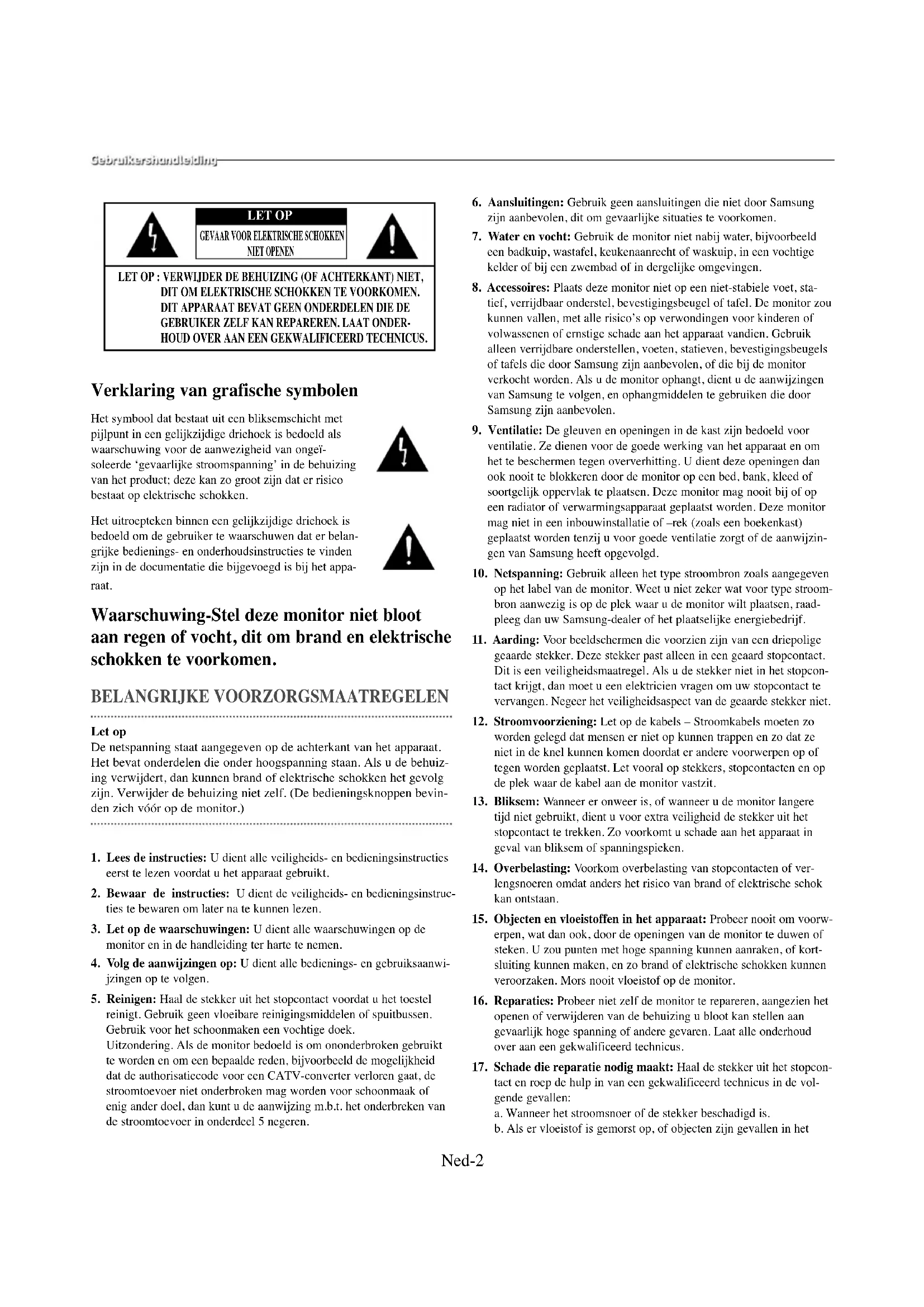 NIET OPENEN LET OPapparaat. c. Als de monitor is blootgesteld aan regen of water. d. Als de monitor niet normaal functioneert, ondanks dat u de gebruiksaanwijzingen volgt. Kom alleen aan knoppen die in de gebruikershandleiding worden genoemd. Het onjuist instellen van andere knoppen kan schade veroorzaken of slechts na veel werk door een gekwalificeerd technicus de monitor weer geschikt maken voor gebruik. e. Als de monitor is gevallen of als de behuizing beschadigd is. f. Als de monitor duidelijk anders functioneert dan eerst – dit is een indicatie dat onderhoud noodzakelijk is.