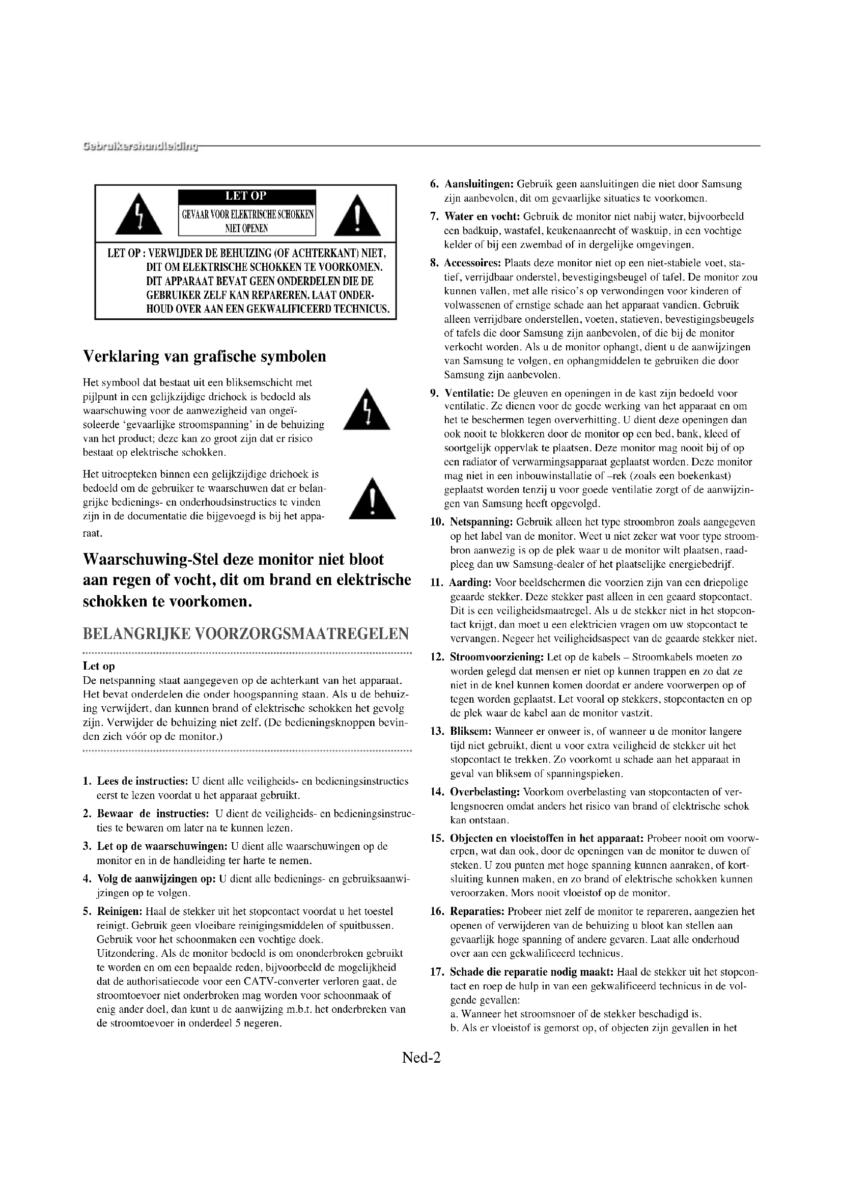 NIET OPENEN LET OPapparaat. c. Als de monitor is blootgesteld aan regen of water. d. Als de monitor niet normaal functioneert, ondanks dat u de gebruiksaanwijzingen volgt. Kom alleen aan knoppen die in de gebruikershandleiding worden genoemd. Het onjuist instellen van andere knoppen kan schade veroorzaken of slechts na veel werk door een gekwalificeerd technicus de monitor weer geschikt maken voor gebruik. e. Als de monitor is gevallen of als de behuizing beschadigd is. f. Als de monitor duidelijk anders functioneert dan eerst – dit is een indicatie dat onderhoud noodzakelijk is.