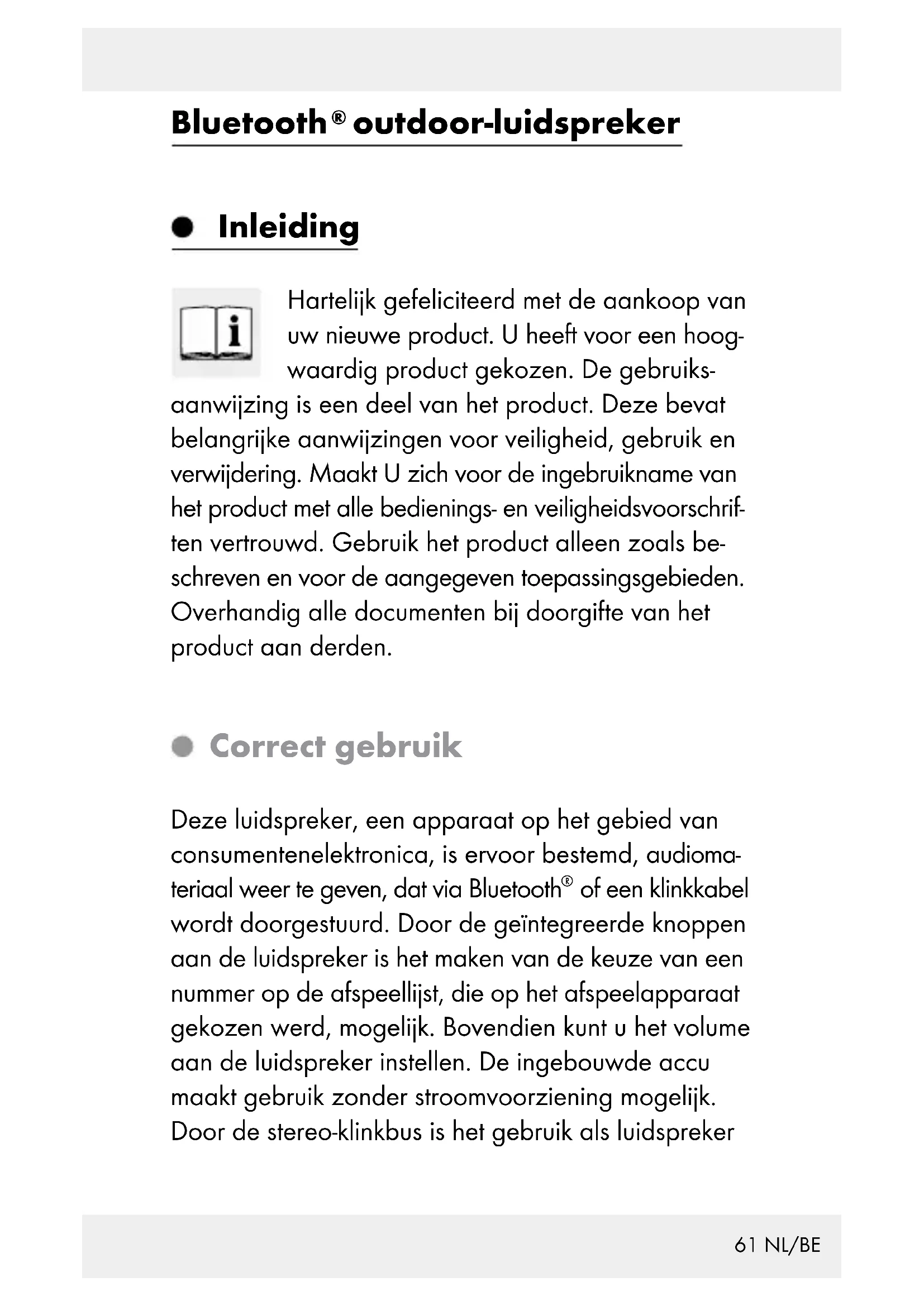 outdoor-luidspreker Inleiding Hartelijk gefeliciteerd met de aankoop van uw nieuwe product. U heeft voor een hoog- waardig product gekozen. De gebruiks- aanwijzing is een deel van het product. Deze bevat belangrijke aanwijzingen voor veiligheid, gebruik en verwijdering. Maakt U zich voor de ingebruikname van het product met alle bedienings- en veiligheidsvoorschrif- ten vertrouwd. Gebruik het product alleen zoals be- schreven en voor de aangegeven toepassingsgebieden. Overhandig alle documenten bij doorgifte van het product aan derden. Correct gebruik Deze luidspreker, een apparaat op het gebied van consumentenelektronica, is ervoor bestemd, audioma- teriaal weer te geven, dat via Bluetooth