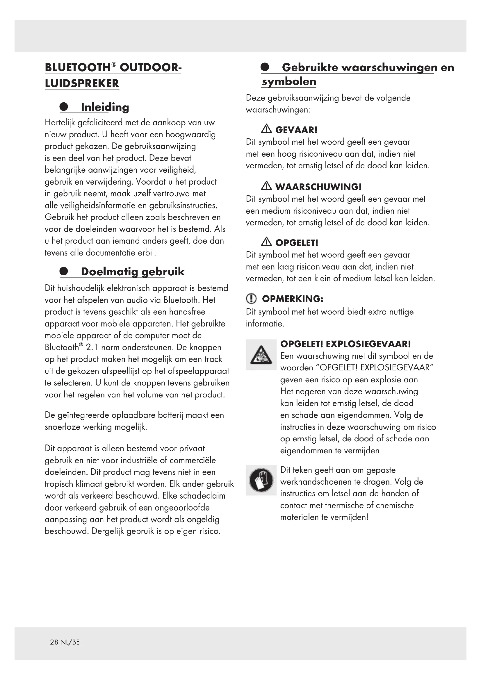 OUTDOOR- LUIDSPREKER Inleiding Hartelijk gefeliciteerd met de aankoop van uw nieuw product. U heeft voor een hoogwaardig product gekozen. De gebruiksaanwijzing is een deel van het product. Deze bevat belangrijke aanwijzingen voor veiligheid, gebruik en verwijdering. Voordat u het product in gebruik neemt, maak uzelf vertrouwd met alle veiligheidsinformatie en gebruiksinstructies. Gebruik het product alleen zoals beschreven en voor de doeleinden waarvoor het is bestemd. Als u het product aan iemand anders geeft, doe dan tevens alle documentatie erbij. Doelmatig gebruik Dit huishoudelijk elektronisch apparaat is bestemd voor het afspelen van audio via Bluetooth. Het product is tevens geschikt als een handsfree apparaat voor mobiele apparaten. Het gebruikte mobiele apparaat of de computer moet de Bluetooth