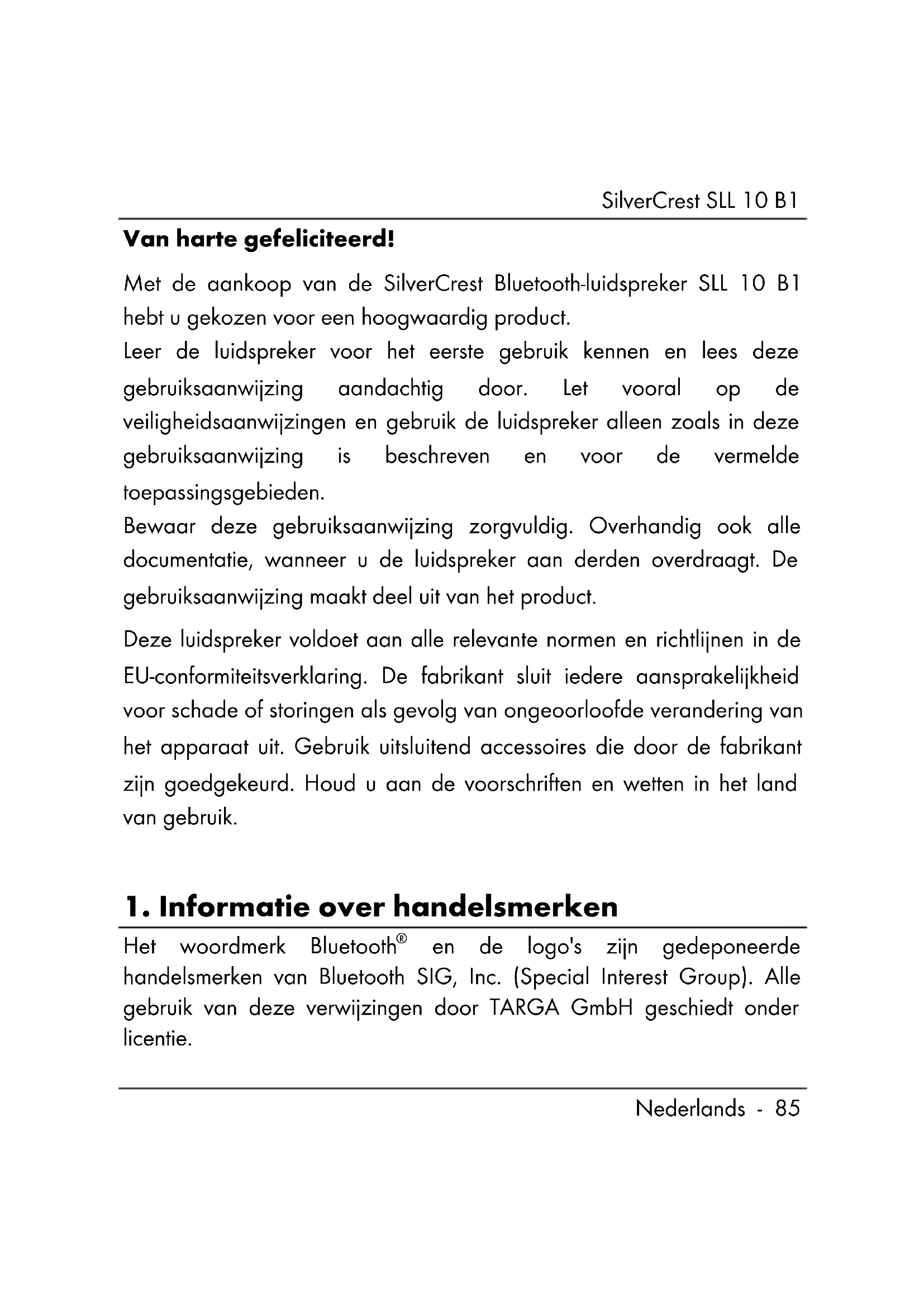 en de logo's zijn gedeponeerde handelsmerken van Bluetooth SIG, Inc. (Special Interest Group). Alle gebruik van deze verwijzingen door TARGA GmbH geschiedt onder licentie.SilverCrest SLL 10 B1