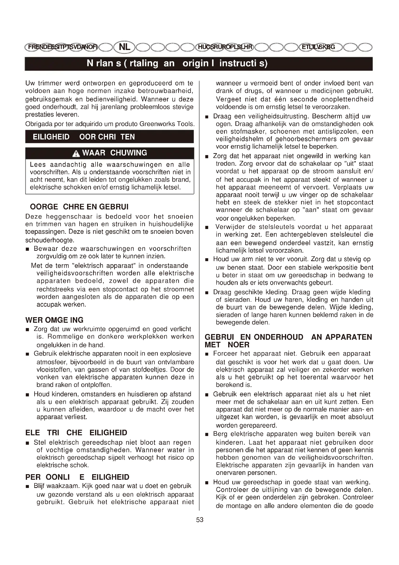 FR EN DE ES IT PT SV DA NO FI HU CS RU RO PL SL HR HU CS RU RO PL SL HR ET L T LV SK BG ET LT LV SK BG Uw trimmer werd ontworpen en geproduceerd om te voldoen aan hoge normen inzake betrouwbaarheid, gebruiksgemak en bedienveiligheid. Wanneer u deze goed onderhoudt, zal hij jarenlang probleemloos stevige prestaties leveren. Obrigada por ter adquirido um produto Greenworks Tools.