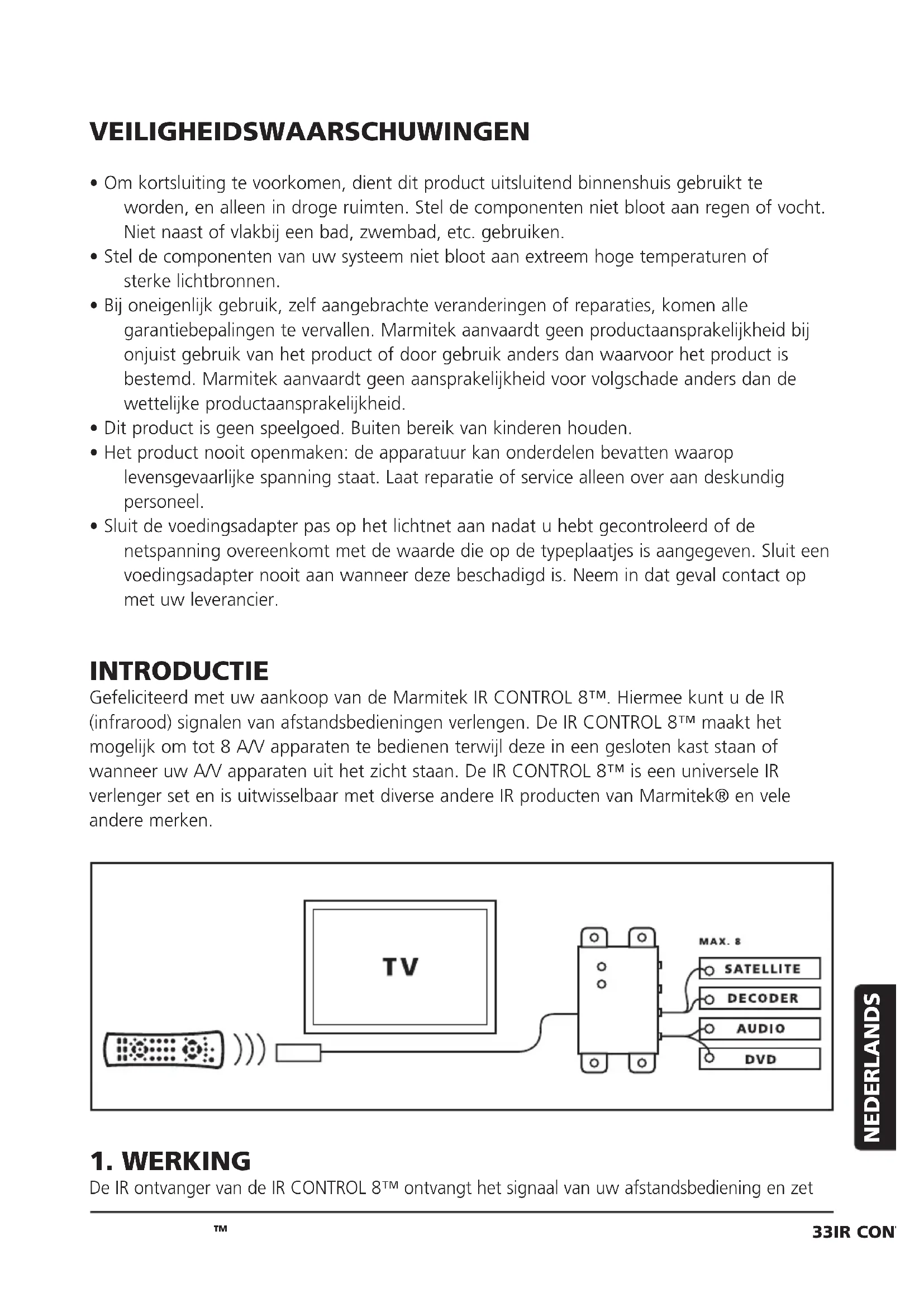 - Sluit de voedingsadapter pas op het lichtnet aan nadat u hebt gecontroleerd of de netspanning overeenkomt met de waarde die op de typeplaatjes is aangegeven. Sluit een voedingsadapter nooit aan wanneer deze beschadigd is. Neem in dat geval contact op met uw leverancier. INTRODUCTIE Gefeliciteerd met uw aankoop van de Marmitek IR CONTROL 8™. Hiermee kunt u de IR (infrarood) signalen van afstandsbedieningen verlengen. De IR CONTROL 8™ maakt het mogelijk om tot 8 A/V apparaten te bedienen terwijl deze in een gesloten kast staan of wanneer uw A/V apparaten uit het zicht staan. De IR CONTROL 8™ is een universele IR verlenger set en is uitwisselbaar met diverse andere IR producten van Marmitek® en vele andere merken.