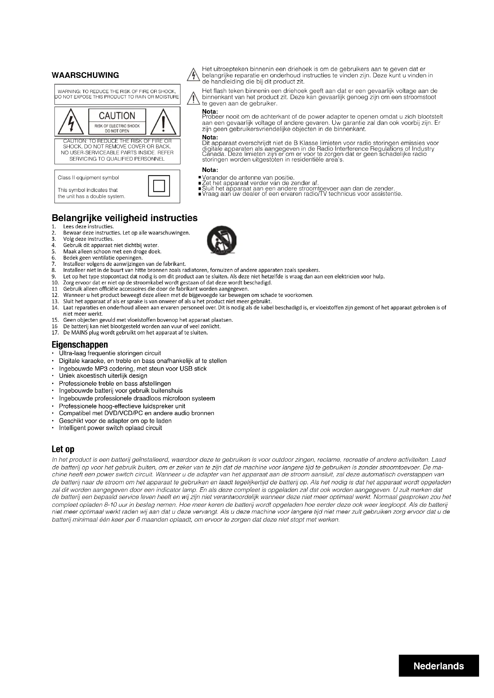 In het product is een batterij geinstalleerd, waardoor deze te gebruiken is voor outdoor zingen, reclame, recreatie of andere activiteiten. Laad de batterij op voor het gebruik buren, om er zeker van te zich dat de machine voor langere tijd te gebruiken is zonder stroomtoevoer. De machine heeft een power switch circuit. Wanner u de adapter van het apparatus aan de stroom aansluit, za deze automatisch overstappen van de batterij waar de stroom om het apparatusaat te gebrueken en laadt tegelijkertijd de batterij op. Als het nodig is dat het apparatusaat wordt opgeladen zal dit worden aangegeven door een indicator lamp. En als deze compleet is opgeladen za dat ook worden aangegeven. U zult merken dat de batterij een bepaald service leven heeft en wij zich net verzantwoordelijk wanner ne Zoer mee optimaal werk. Normaal gesproken zo het compleet opladen 8-10 uur in beslag nemen. Hoe更是 keren de batterij wordt opgeladen hoe eender deze ook weer leegloopt. Als de batterij nicht更是 optimaal werk raden wij aan dat u deze verrangt. Als u deze machine voor langere tijd neteer zult gebruiken zorg ervoor dat u de batterij minimaal een keer per 6 maanden oplaadt, om ervoort zorgen dat deze net stopt met werken.