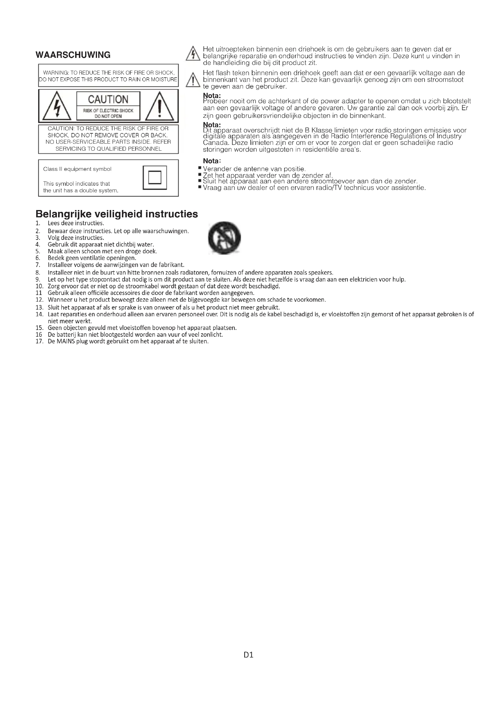 Het flash teken binnenin een driehoek geeft aan dat er een gevaarlijk voltage aan de binnenkant van het product zit. Deze kan gevaarlijk genoeg zijn om een stroomstoot te geen aan de gebruiker.