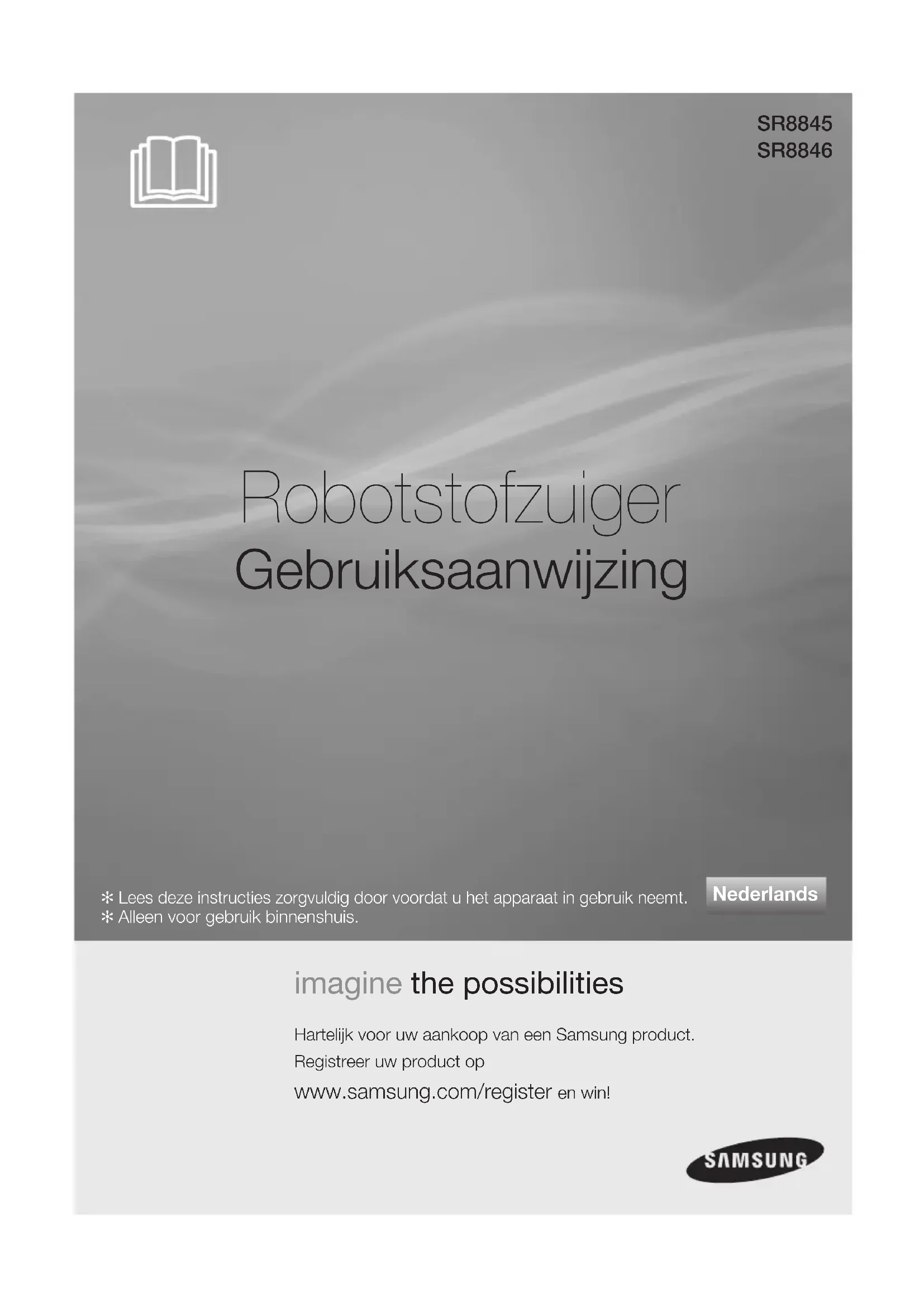 Vous pouvez également vous connectez à notre site internet http://www.samsung.com DJ68-00518K(8845-XEF)-0.4.indb 46 2011.3.22 10:53:16 AMimagine the possibilities Hartelijk voor uw aankoop van een Samsung product.Registreer uw product op www.samsung.com/register en win! Nederlands ✻ Lees deze instructies zorgvuldig door voordat u het apparaat in gebruik neemt.✻ Alleen voor gebruik binnenshuis. Gebruiksaanwijzing Robotstofzuiger SR8845 SR8846 DJ68-00518K(8845-XEF)-0.4.indb 1 2011.3.22 10:53:17 AM2_ Veiligheidsinformatie Veiligheidsinformatie