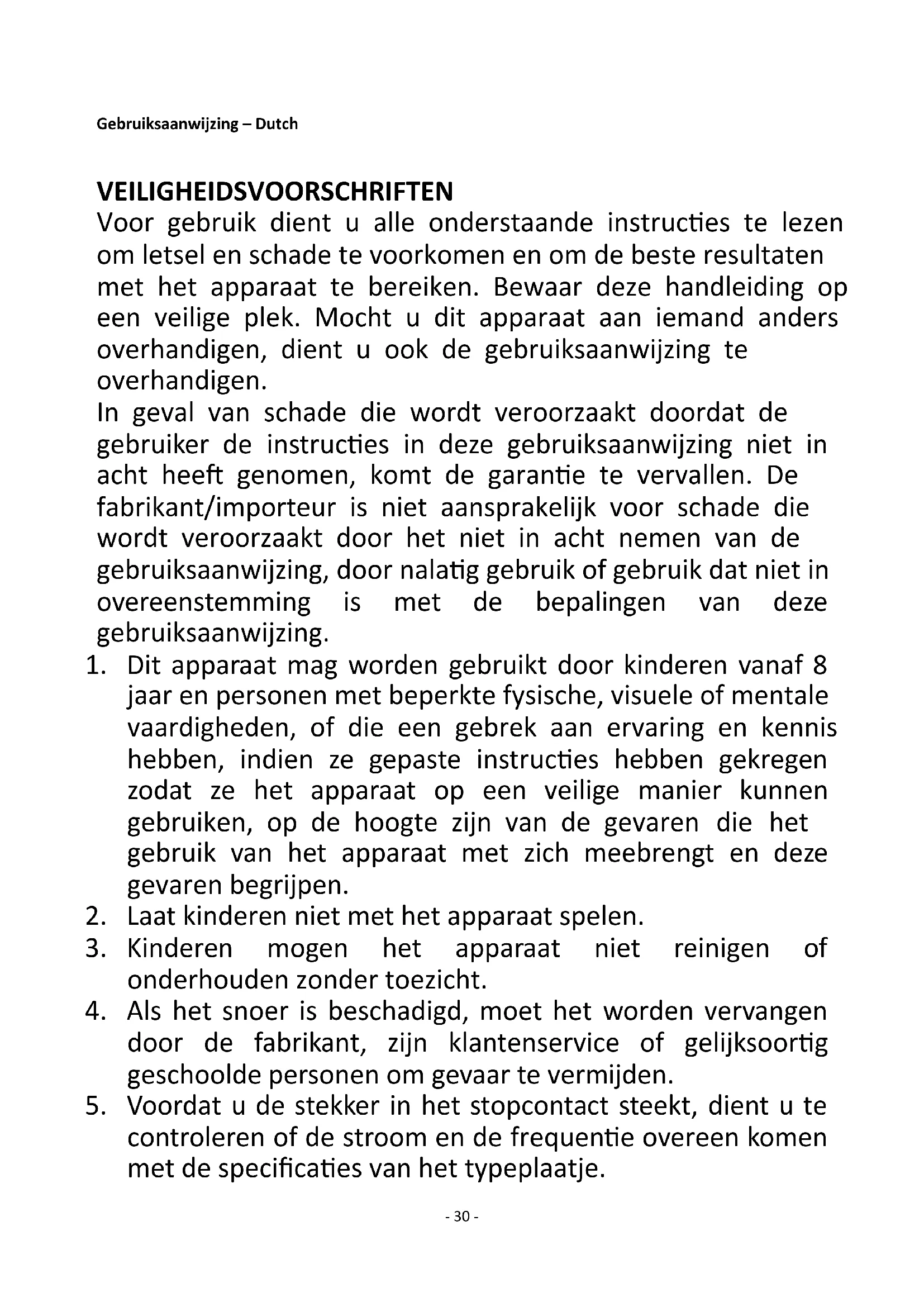 Återvinning – EU-direktiv 2012/19/EU Denna markering indikerar att produkten inte får kastas tillsammans med övrigt hushållsavfall. För att förhindra eventuell skada på miljön eller människors hälsa på grund av okontrollerad avfallshantering, återvinns de på ett ansvarsfullt sätt som främjar en hållbar återanvändning av materiella resurser. För att återlämna den använda enheten, använd retur- och insamlingssystem eller kontakta återförsäljaren där produkten var köpt. De kan ta denna produkt för miljösäker återvinning.- 29 - Emerio Deutschland GmbH (no service address) Höfferweg 14 51519 Odenthal Germany Kundservice: T: +49 (0) 3222 1097 600 E: info.de@emerio.eu- 30 - Gebruiksaanwijzing – Dutch VEILIGHEIDSVOORSCHRIFTEN Voor gebruik dient u alle onderstaande instructies te lezen om letsel en schade te voorkomen en om de beste resultaten met het apparaat te bereiken. Bewaar deze handleiding op een veilige plek. Mocht u dit apparaat aan iemand anders overhandigen, dient u ook de gebruiksaanwijzing te overhandigen. In geval van schade die wordt veroorzaakt doordat de gebruiker de instructies in deze gebruiksaanwijzing niet in acht heeft genomen, komt de garantie te vervallen. De fabrikant/importeur is niet aansprakelijk voor schade die wordt veroorzaakt door het niet in acht nemen van de gebruiksaanwijzing, door nalatig gebruik of gebruik dat niet in overeenstemming is met de bepalingen van deze gebruiksaanwijzing.