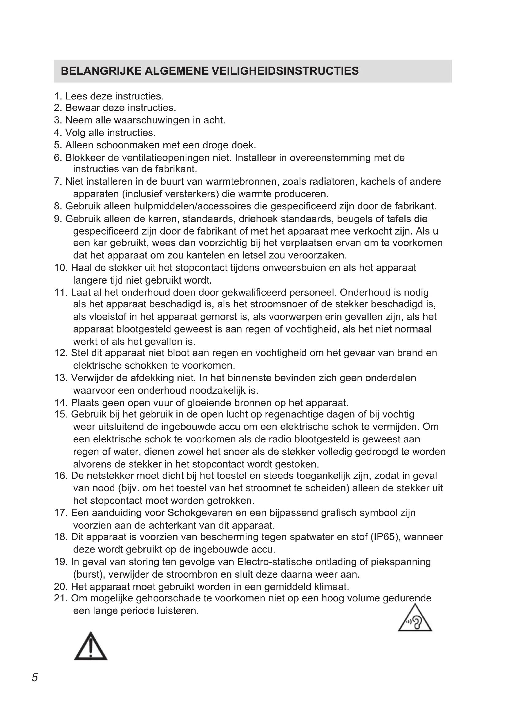 weer uitsluitend de ingebouwde accu om een elektrische schok te vermijden. Om een elektrische schok te voorkomen als de radio blootgesteld is geweest aan regen of water, dienen zowel het snoer als de stekker volledig gedroogd te worden alvorens de stekker in het stopcontact wordt gestoken.