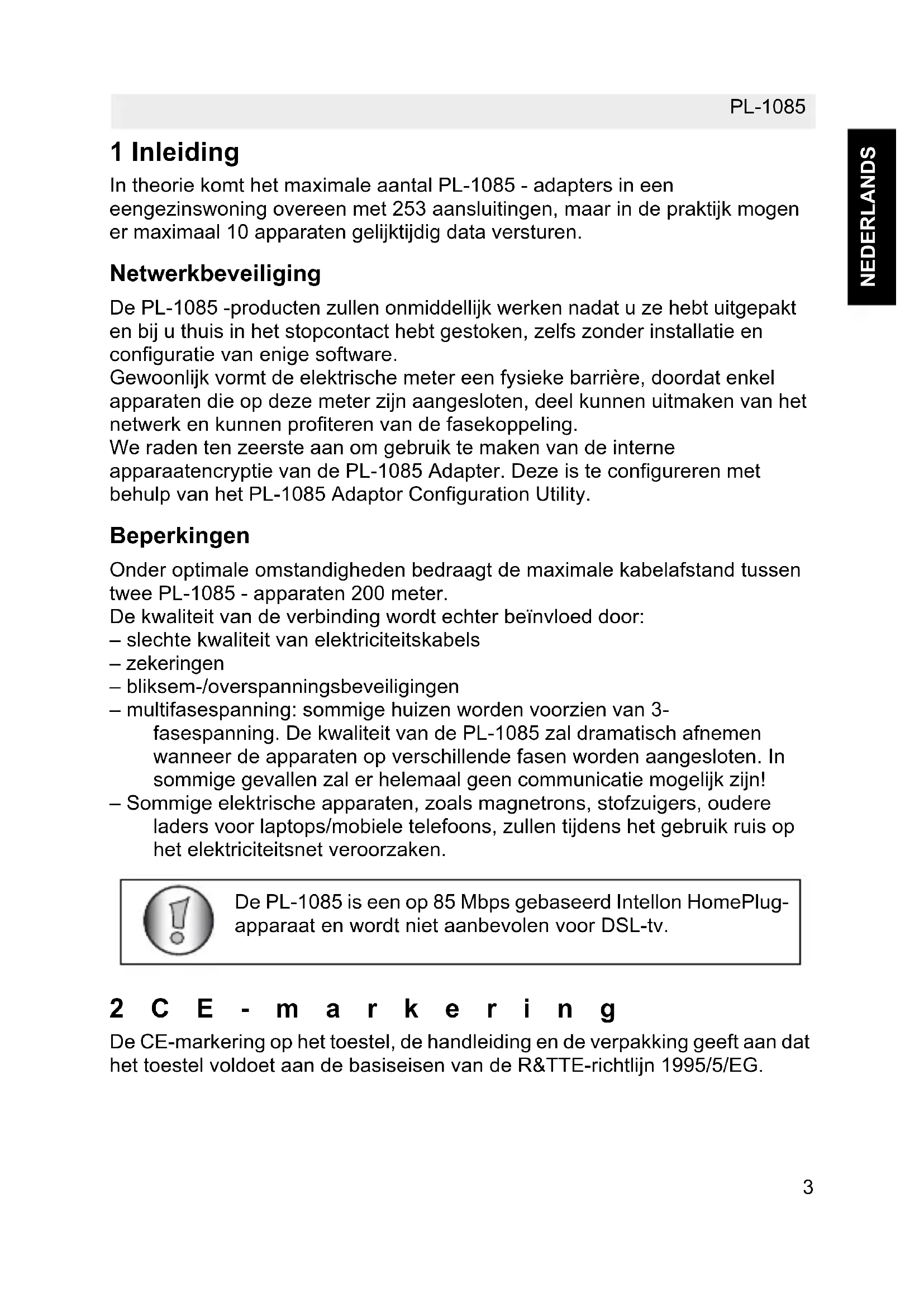 - multifasespanning: sommige huizen worden voorzien van 3-fasespanning. De kwaliteit van de PL-1085 za dramatisch afnemen wanner de apparaten op verschillende fasen worden aangesloten. In sommige geallen zal er helemaal geen communicatie möglichk+zijn!