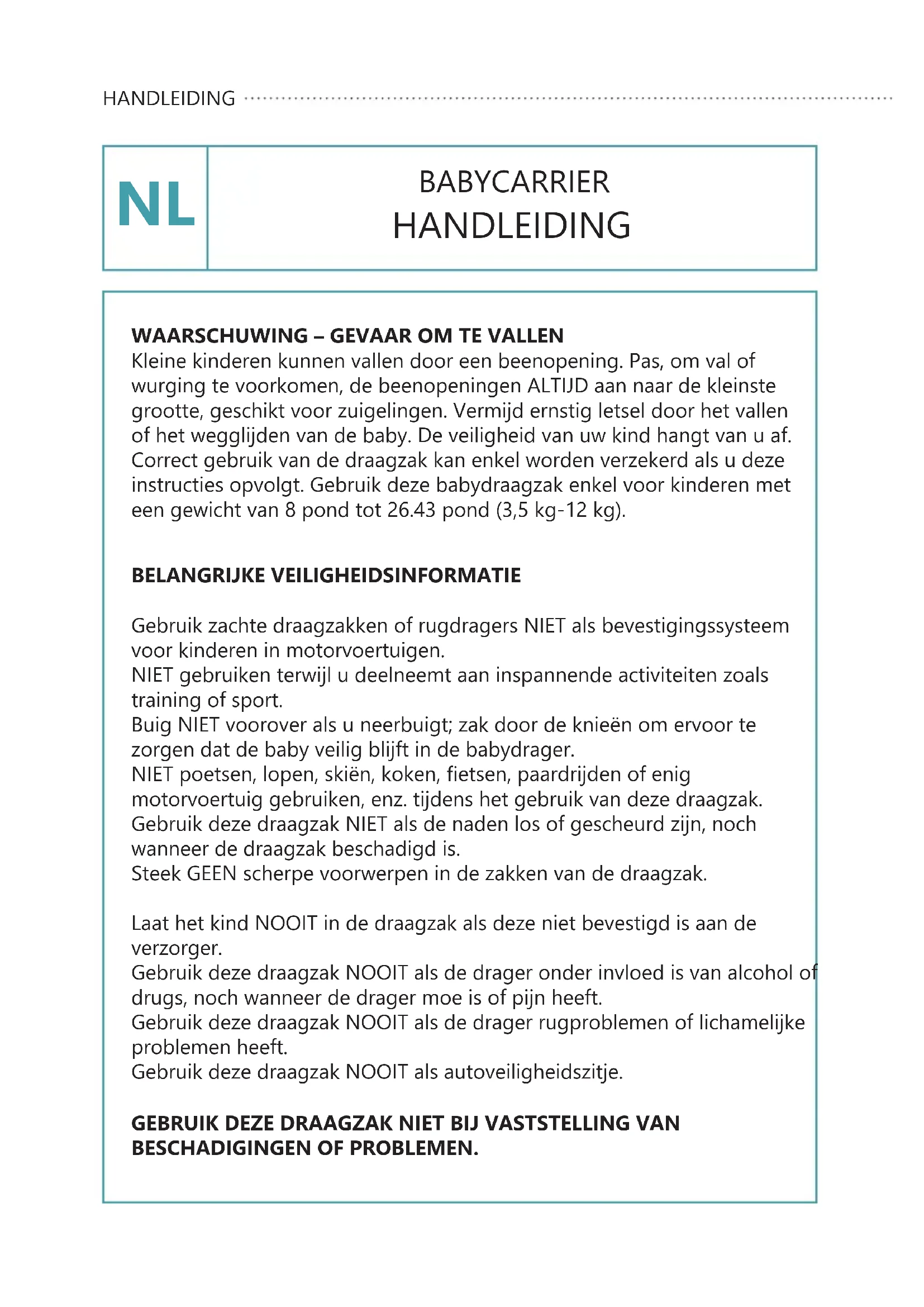 Kleine kinderen kunnen vallen door een beenopening. Pas, om val of wurging te voorkomen, de beenopeningen ALTIJD aan naar de kleinste grootte, geschikt voor zuigelingen. Vermijd ernstig letsel door het vallen of het wegglijden van de baby. De veiligheid van uw kind hangt van u af. Correct gebruik van de draagzak kan enkel worden verzekerd als u deze instructies opvolgt. Gebruik deze babydraagzak enkel voor kinderen met een gewicht van 8 pond tot 26.43 pond (3,5 kg-12 kg).